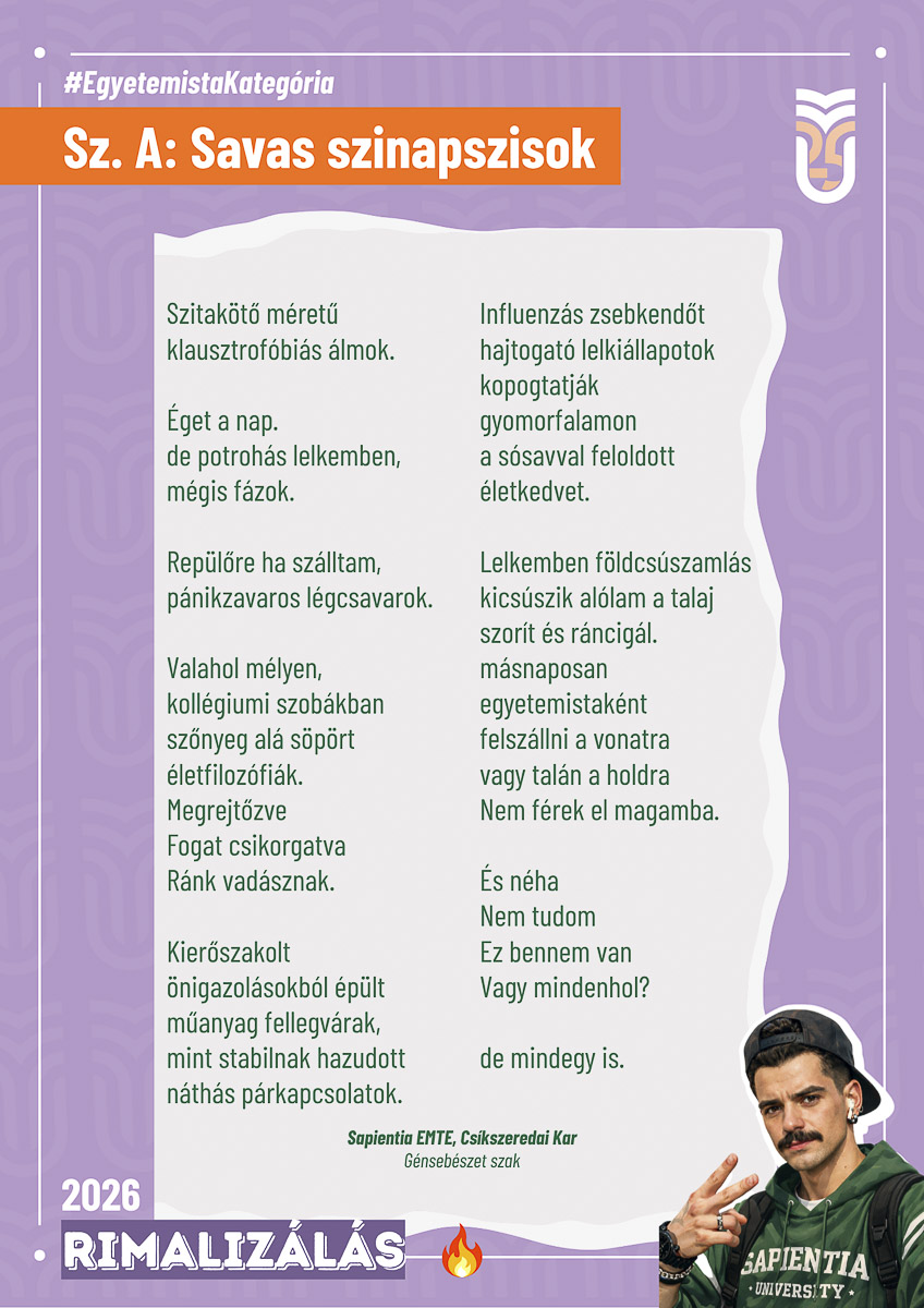 A magyar költészet napja alkalmából idén is meghirdette versíró versenyét a Sapientia – EMTE Csíkszeredai Kara. A Rímek rimalizálása program évről évre egyre népszerűbb, és ezúttal is sokakat ösztönzött alkotásra