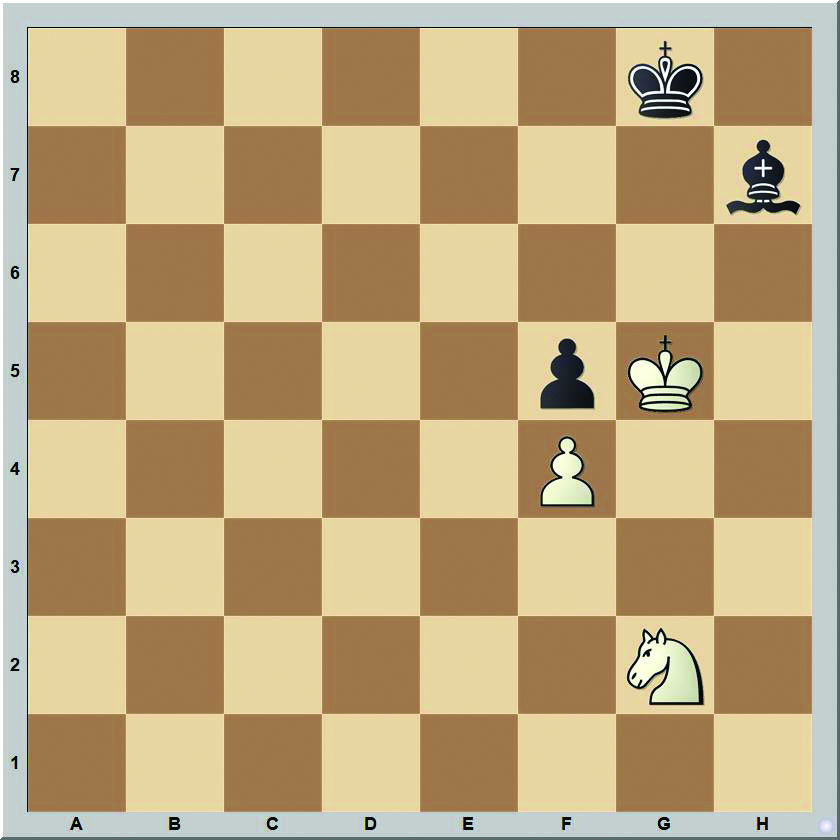 Alekszej Troickij 1898-ban szerkesztett művében világos lépéskényszerrel nyer: 1.Kh6! Kg8 2.Hh4 Kg8 3.Hf3 Kh8 4.He5! Kg8 (4...Fg8 5.Hg6 matt) 5.Hc6 Kh8 6.He7!! Fg8 7.Hg6 matt.