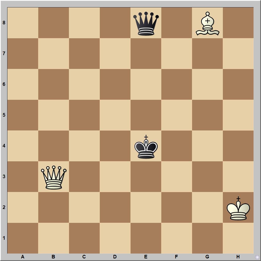A sötét király kiszolgáltatott helyzete miatt világos három lépésben nyer Troitzky 1898-ban szerkesztett művében: 1.Fh7+ Kd4 (1...Kf4 2.Vg3 matt) 2.Vb4+ Kd5 3.Fg8+!! és sötét vezért veszít (3...Vg8 után 4.Vb3+, 3...Kc6 esetén 4.Va4+, vagy 3...Ke5 4.Ve1+)