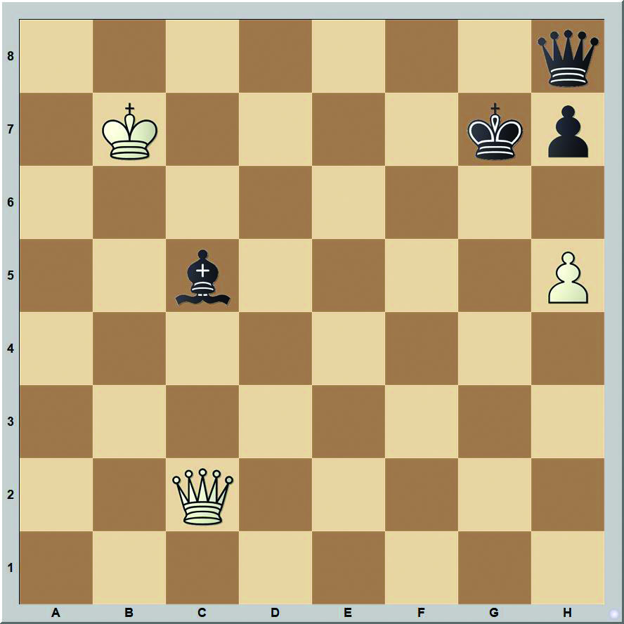David Gurgenidze grúz tanulmányszerző 1976-ban szerkesztett művében világos futóhátrányban van, de vezére lépcsőzetesen közelít a sötét királyhoz, majd gyalogja mattot ad: 1.Vb2+! (csak döntetlenre lenne elég 1.Vc3+? Kg8 2.Vc4+ Kg7) Kg8 2.Va2+! Kg7 (2…Kf8 után 3.Va8+ Kg7 4.h6+ vezérnyerés) 3.Va1+ Kg8 4.Va8+ Ff8 (4…Kg7 után 5.h6+ nyer) 5.Va2+! Kg7 6.Vb2+ Kg8 7.Vb3+ Kg7 8.Vc3+ Kg8 9.Vc4+ Kg7 10.Vd4+ Kg8 11.Vd5+ Kg7 12.Ve5+ Kg8 13.Ve6+ Kg7 14.h6 matt.