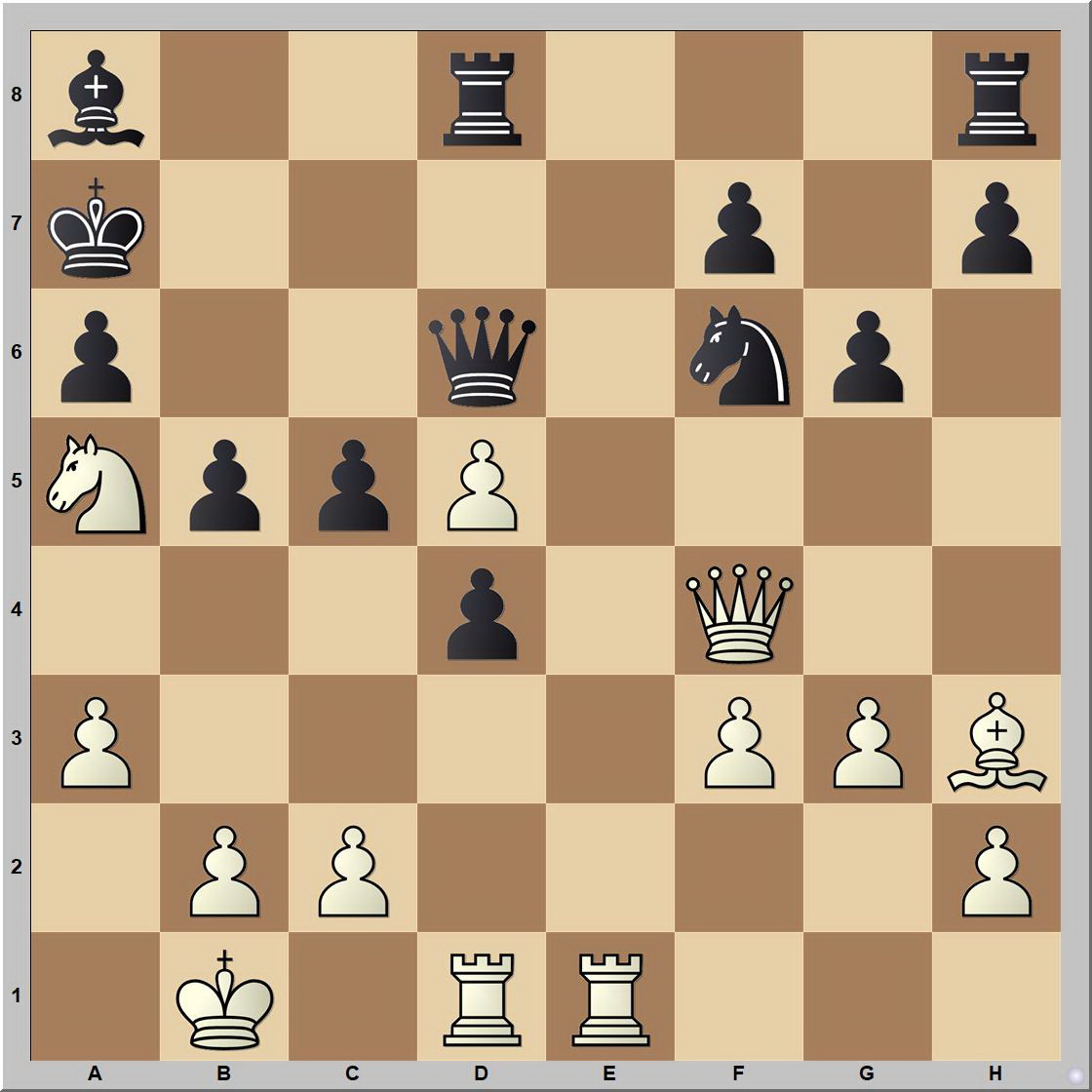 1.d4 d5 2.c4 e5 3.de5 d4 (az alapötlet a b1 huszár fejlődésének zavarása, világos kettősgyalogja az e-vonalon pedig később sebezhető) 4.e3?! (4.Hf3 Hc6 a logikus fejlődés és 5.a3 vagy 5.Hdb2 után 5…Hge7) Fb4+ 5.Fd2 de3! 6.Fb4?? (innen már nincs visszaút, de 6.fe3 Vh4+ 7.g3 Ve4 8.Hf3 Ve3+ is sötétnek kedvező az „egészségesebb” gyalogszerkezet miatt) ef2+ 7.Ke2 (7.Kf2 Vd1 vezérnyerés, most viszont a mellettem játszók kuncogása közepette elmentem egy szabad huszárért) fg1H+!! 8.Bg1?? (mentségére legyen mondva, hogy 8.Ke1 Vh4+ 9.Kd2 Hc6 10.Fc3 Fg4 vagy 9.g3 Ve4+ is sötétet igazolja) Fg4+ és világos feladta (0–1).