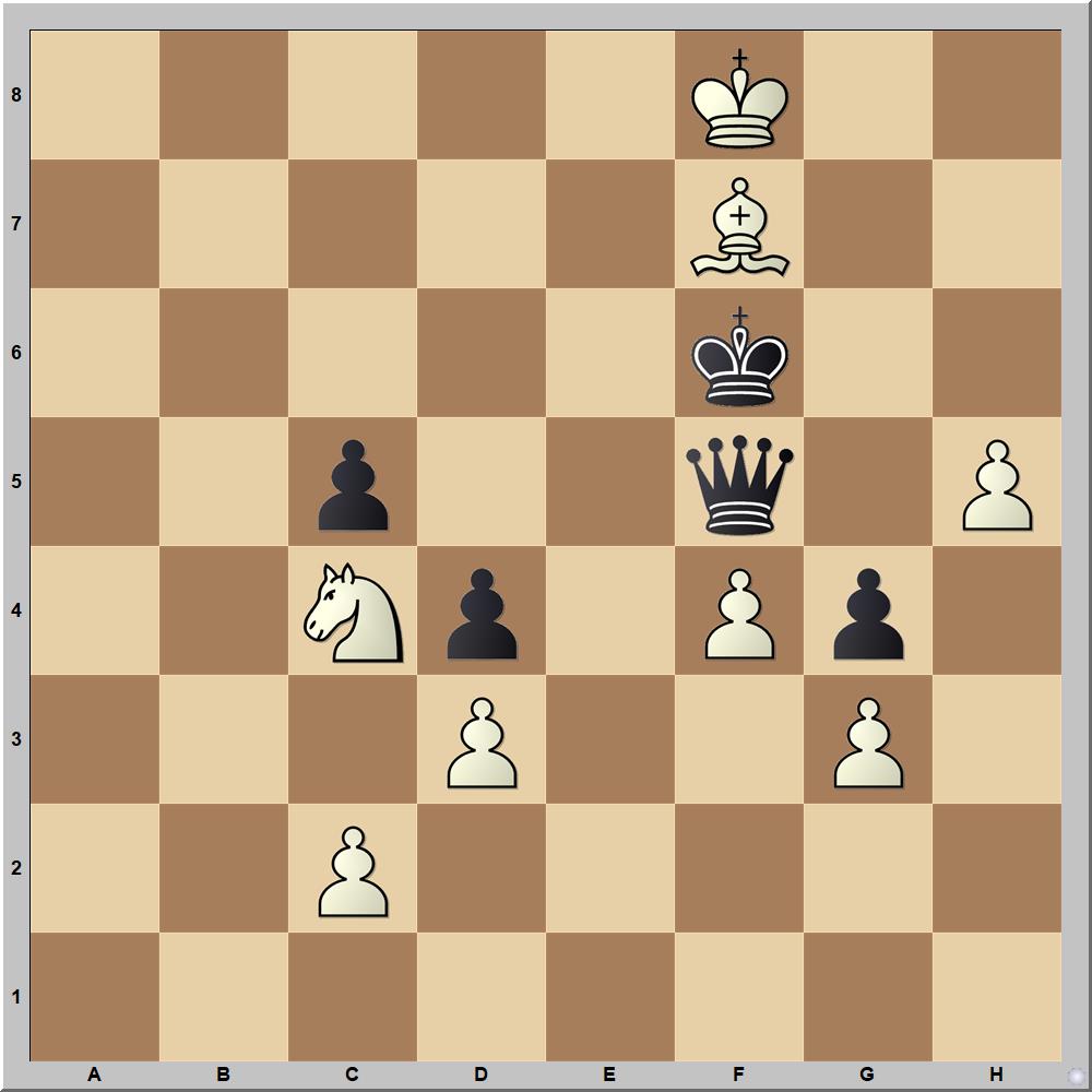 Bernhard Horwitz 1884-es művében sötét királyának kiszolgáltatott helyzete miatt a vezér nem tud védelmet nyújtani, és világos nyer: 1.Hd6! Vd7 (1...Vh7 után 2.He8+ Kf5 3.Ke7! Vh6 4.Fg6+ Vg6 5.hg6 Kg6 6.Ke6 gyorsabban ad mattot, de a győzelemhez 3.Fg6+ is elegendő) 2.He4+ Kf5 3.Fg6+ Ke6 4.Hc5 sakk-sekk lenyeri a vezért.