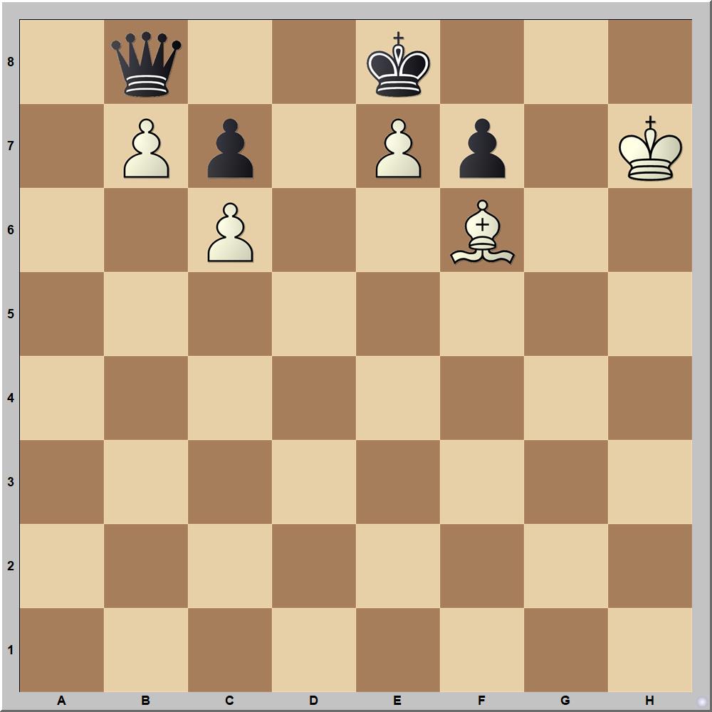 Bernhard Horwitz 1884-es művében sötét vezére tehetetlen, a lépéskényszer miatt világos nyer: 1.Kg8!! Va7 2.Fd4!! Vb8 (2...Vd4 után 3.b8V+ Ke7 4.Vc7+ Ke8 5.Vb8+ Vd8 6.c7, vagy 4...Ke6 után 5.Vf7+ Kd6 6.Vd7+ nyer) 3.Fc5 f5 4.Kg7 f4 5.Kf6 f3 6.Ff2!! Va7 7.Fa7 f2 8.b8B matt.