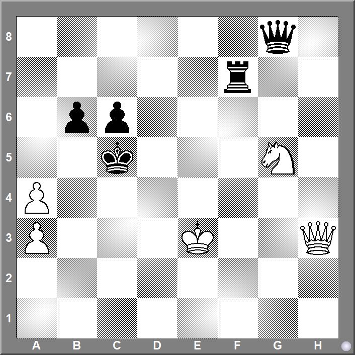 Alekszej Troitszkij 1895-ben közölt tanulmányában világos lenyeri sötét vezérét: 1.He4+! Kd5 (1…Kc4 2.Ve6 matt) 2.Hf6+!! Bf6 3.Vd7+! Ke5 (3…Bd6 után 4.Vf5+ Kc4 5.Vc2+ Kd5 6.Vb3+ vezérnyerés, vagy 3…Kc4?? 4.Vd3+ Kc5 5.Vd4 matt) 4.Vd4+ Kf5 (4…Ke6 5.Vc4+ lenyeri a vezért) 5.Ve4+ Kg5 6.Vg2+, és világos nyer (1–0).