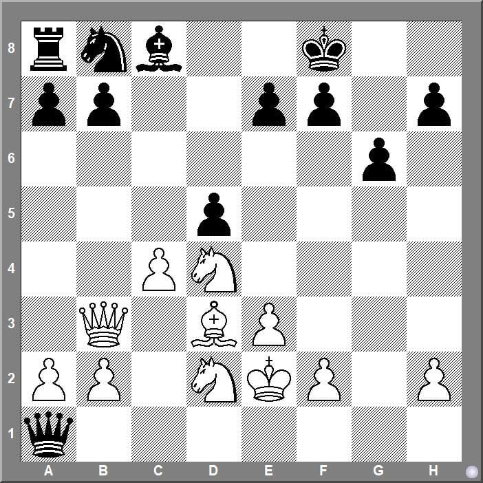 1.Hf3 Hf6 2.d4 g6 3.Fg5 Fg7 4.Hbd2 d5 5.e3 0–0 6.Fd3 c5 7.c3 Vb6 8.Vb3 Ve6 (új lépés, elődje 8…c4 9.Vb6 ab6 10.Fc2 Ff5 volt. Most a vezér kalandos útra téved) 9.c4 cd4 10.Hd4 Vg4 11.Ff6 Vg2?! (egyszerűbb 11…Ff6) 12.Fg7! Vh1+ 13.Ke2 Va1 14.Ff8 Kf8?? (óvatlan lépés, előbb 14…e5! kellett, és 15.Hb5 Kf8 tartaná az egyensúlyt. Most a vezért kelepcébe fogják, lásd az ábrát) 15.Fb1!! Fg4+ 16.f3 Ff5 17.Hf5 gf5 18.Vb7 dc4 19.Ff5 Kg7 20.Hc4 Vg1 21.Va8 Vh2+ 22.Kd3 Ha6 23.Va7 Hb4+ 24.Kc3, és sötét feladta (1–0).
