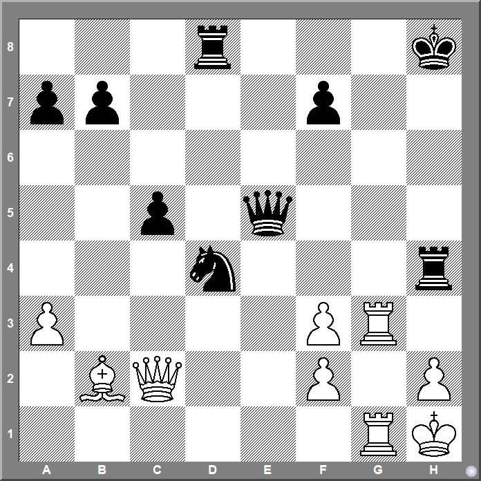 1.d4 Hf6 2.c4 e6 3.Hc3 Fb4 4.e3 0-0 5.Fd3 d5 6.Hf3 c5 7. 0-0 Hc6 8.a3 Fc3 9.bc3 Vc7 10.Vc2 dc4 11.Fc4 e5 12.Fd3 Be8 13.e4 ed4 14.cd4 Fg4 15.e5 Ff3 16.ef6 Hd4 17.Fh7+ Kh8 18.fg7+ Kg7 19.Fb2 Bad8 20.gf3 Bh8 21.Kh1 Bh7?? (jobb 21…Kf8 22.Fd4 Bd4 23.Bfc1 Bh4 24.Vc5+ Vc5 25.Bc5 B8h7 egyenlő állással) 22.Bg1+ Kh8 23.Bg3 Ve5 24.Bag1 Bh4 (Lásd az ábrát) 25.Vc1!! Kh7 26.Vb1+ Kh8 27.Vf1 Ve6 28.Vg2, és sötét feladta (1-0), mert 28…Vh6 után 29.Bg8+ Kh7 30.Vg7+ Vg7 31.B1g7+ Kh6 32.Fc1+ Bf4 33.Ff4+ Kh5 34.Bh7 matt jöhet.