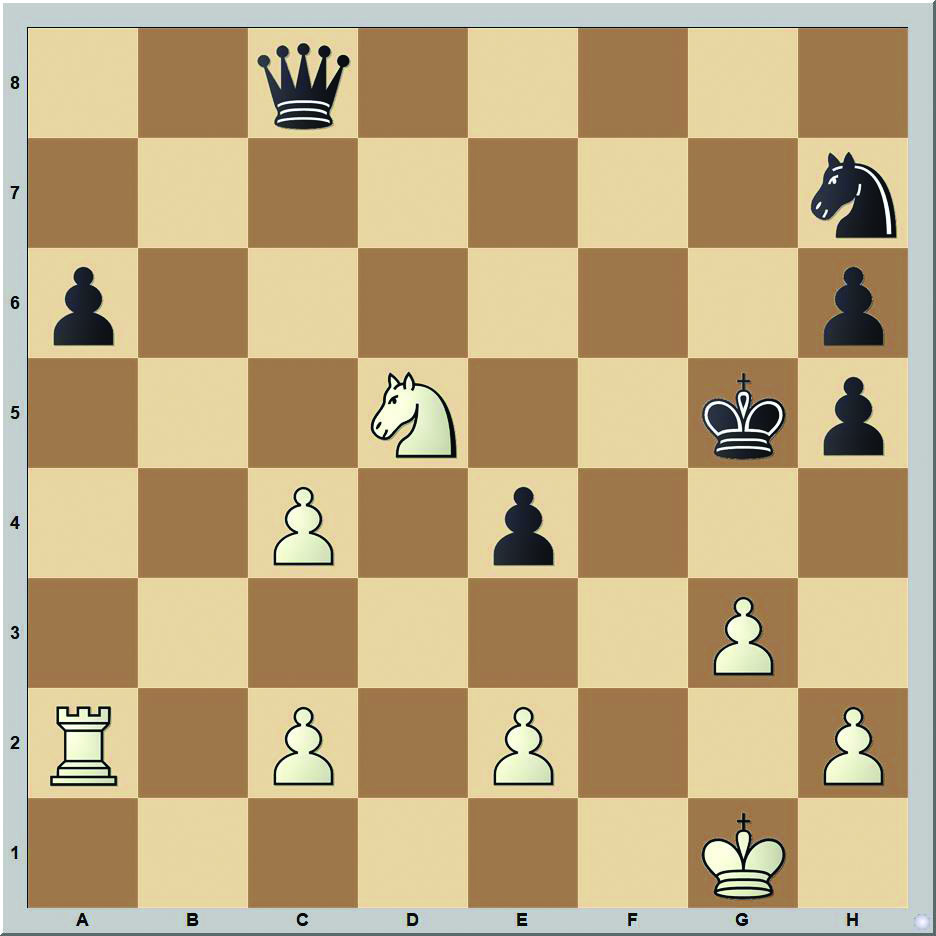 1.d4 Hf6 2.c4 e6 3.Hc3 Fb4 4.e3 b6 5.Hge2 He4 6.Vc2 Fb7 7.a3 Fc3+ 8.Hc3 Hc3 9.Vc3 d6 10.b3 Vh4 11.Fb2 Fe4 (új lépés, elődjében 11…Hd7 12.d5 0-0-0 13.Fe2 ed5 14.cd5 Hc5 15.0-0 történt) 12.Vd2 g5 13.h3 g4 14.0-0-0 Bg8 15.Ve2 Vh5 16.Bg1?! (16.Vd2 tartaná az állást) Hd7 17.Ve1 gh3 18.Fe2 Vh6 19.gh3 0-0-0 20.Bg4? (20.h4 Hf6! is sötétnek kedvező) f5!! 21.Bg8 Bg8 22.h4 Bg2 23.h5 f4 24.f3 Vh5 25.Ff1?? (már nincs mentség, 25.ef4 Ff3 26.Ff3 Vf3 27.Vf1 Ve4! is csak a lépések számát szaporítaná) Bc2+!!, és világos feladta (0-1), mert 26.Kb1 Vh2!! után 11 lépéses matt jöhet, melyben világos minden tisztjét odaadja, persze 26…Be2+ 27.fe4 Be1 28.Be1 Vh4 is sötétet igazolná.