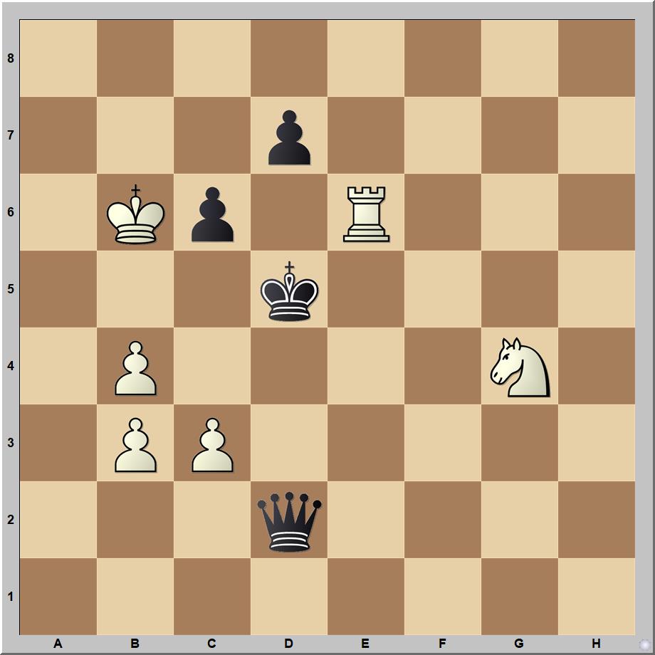 Bernhard Horwitz 1884-es művében világos mindkét tisztjét feláldozza és a gyalogvégjátékban nyer: 1.Be5+ Kd6 2.He3!! Vc3 (2...Vf2 kötésre 3.Kb7!! Ke5 4.Hg4+, míg 2..Ke5 után 3.Hc4+ sakk-sekk van) 3.Hc4+ Vc4 4.bc4 Ke5 5.b5!! (a szerző által közölt megoldásban 5.Kc5? Ke6! 6.b5 cb5! 7.cb5 d5?? 8.b6 nyer, de sötét 7...Ke7! 8.Kb6 d5! 9.Kc5 Kd7 után döntetlent ér el) Kd4 6.Kc7 d5 7.b6, és a világos gyalogból hamarabb lesz vezér.