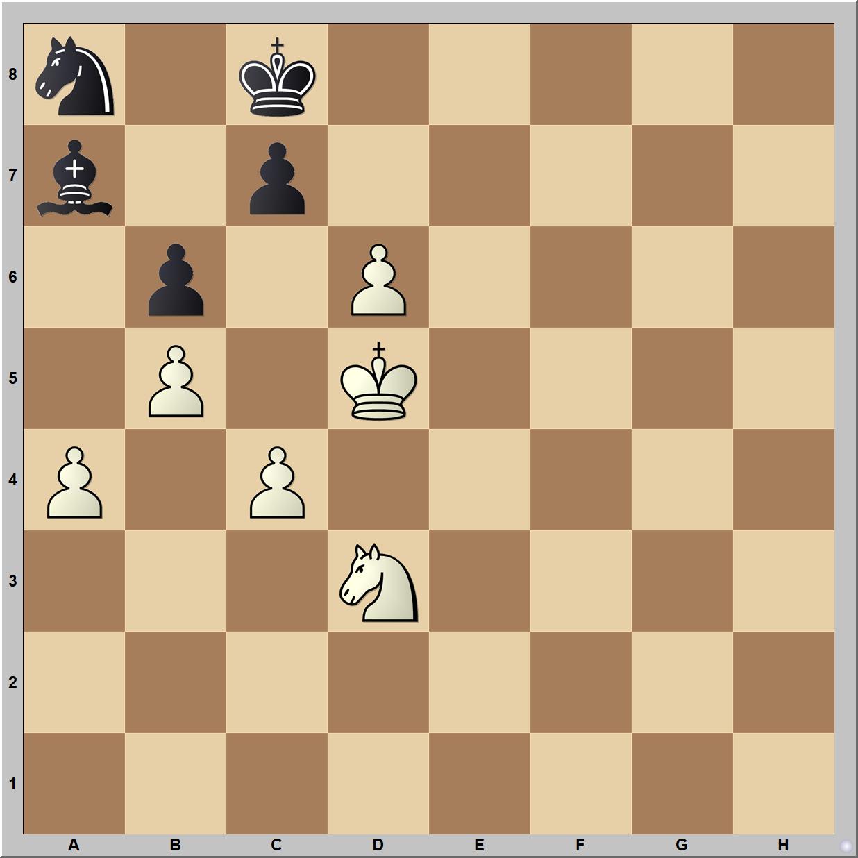 Bernhard Horwitz 1884-ben közölt tanulmányában világos nyer: 1.d7+! Kd7 (1...Kd8 után 2.Kc6 nyer) 2.He5+ Kc8 3.Hc6 Fb8 4.Ke6 Kb7 5.Ke7 Kc8 6.Ke8 Kb7 7.Kd8 Fa7 8.Kd7 Fb8 9.Hd8+ Ka7 10.Kc8!! c5 11.Hc6 matt (1-0).