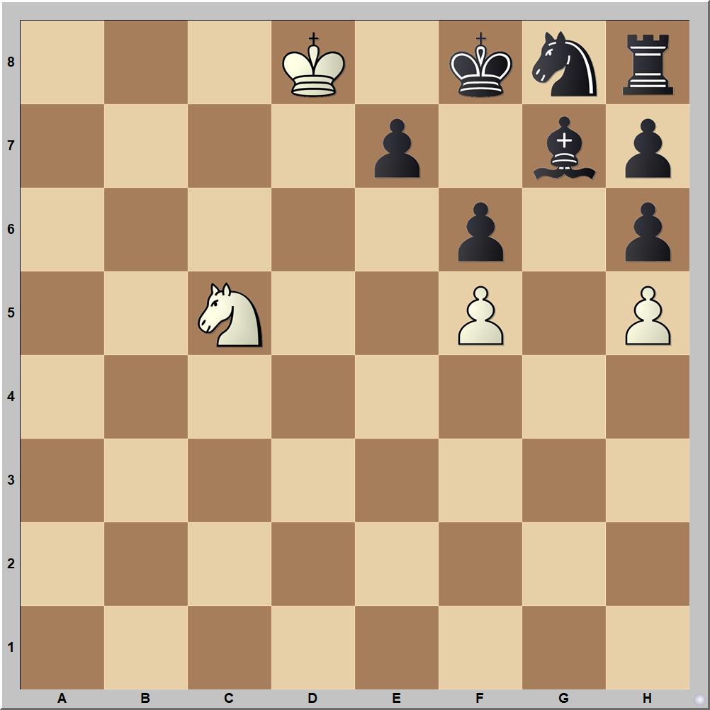Bernhard Horwitz 1883-ban közölt tanulmányában világos öt lépéses mattot ad: 1.He6+ Kf7 2.Kd7! (sötét lépéskényszerbe került) Ff8 3.Hd8+ Kg7 4.Ke8! (újabb lépéskényszer jött létre) e5 5.He6 matt (1-0).