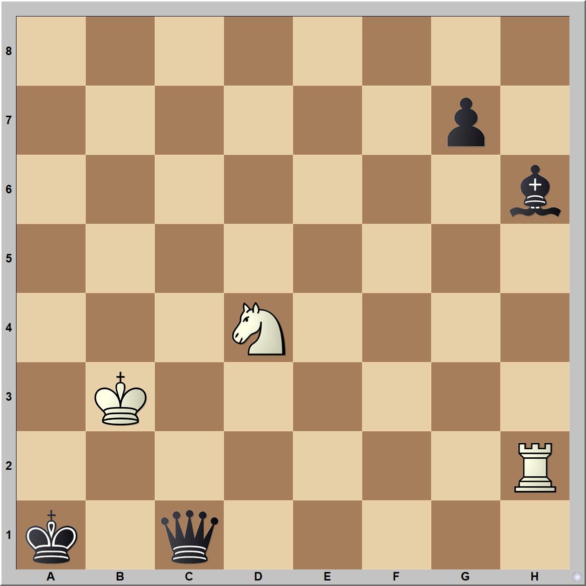 Bernhard Horwitz 1882-es tanulmányában az anyagi hátrány ellenére világos nyer: 1.Ba2+ Kb1 2.Hc2! (fenyeget 3.Ba1 matt) Ve3+ (2…Vc2+ 3.Bc2 Fg5 4.Bg2 Fe3 5.Be2 Fc1 6.Be1 is a főváltozatba vezetne) 3.He3 Fe3 4.Be2! Fh6 5.Be1+ Fc1 6.Bh1 g6 7.Be1 g5 8.Bh1 g4 9.Be1 g3 10.Bh1 g2 11.Bg1 Ka1 12.Bc1 matt (1-0).
