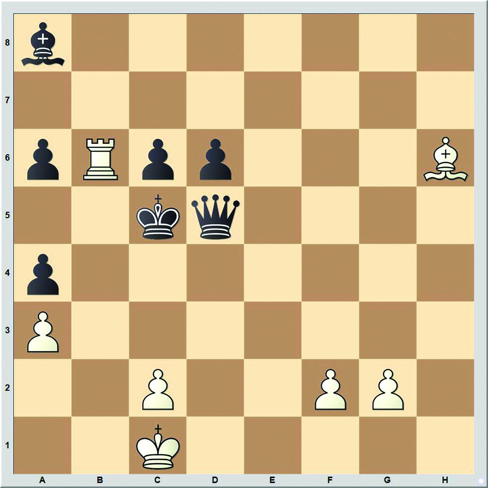 Bernhard Horwitz 1882-es tanulmányában világos győzelmét a sötét király kiszolgáltatott helyzetének köszönheti: 1.Fe3+ Kc4 2.Bb4+ Kc3 3.Bg4!! (3.Fh6? Vd4! 4.Bd4 Kd4 döntetlen) c5 (a vezér helyhez kötött, mert 3…Va2 után 4.Fd2 matt jöhet) 4.f3! (4.Fh6? Ve4! döntetlen) Fc6 5.Fh6!! Vd4 6.Fg7 nyer (1-0).