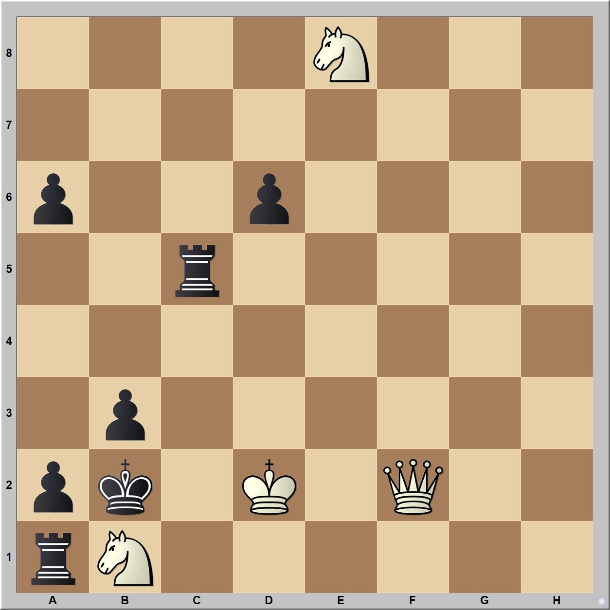 Bernhard Horwitz 1882-es tanulmányában világos vezért áldoz és egy huszárral ad mattot: 1.Vd4+! Kb1 2.Vc5!! (2.Hd6!! is nyer) dc5 3.Hd6! Kb2 4.Hc4+ Kb15.Kd1 a5 6.Kd2 a4 7.Kd1 a3 8.Kd2 b2 9.Ha3 matt (1–0).