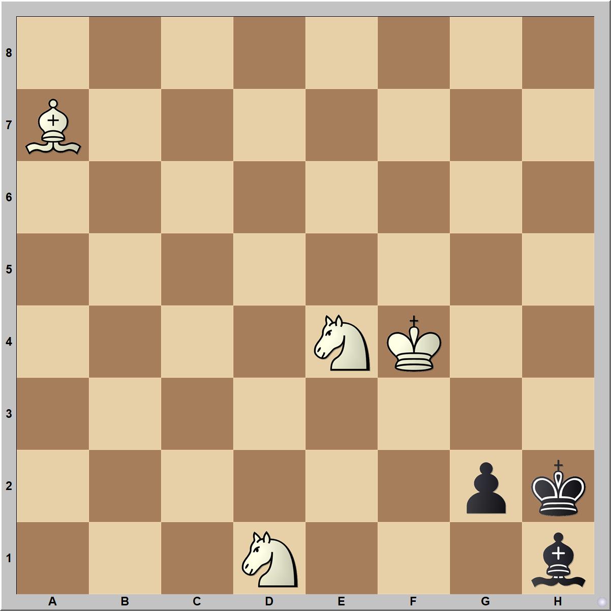 Bernhard Horwitz 1881-es tanulmányában világos a futóját is feláldozza a győzelem érdekében, pedig köztudott, hogy két huszárral nem lehet mattot adni. Itt azonban más a helyzet, hiszen a sötét királyt két „káros” bábja is akadályozza a mozgásában: 1.Fg1+!! Kh3 (1…Kg1 után 2.Hd2 Kh2 3.Hf3+ Kh3 4.Hf2 matt jöhet) 2.Hdf2+ Kh4 3.Hg4 Kh5 (3…Kh3 után 4.Kf5 Kh4 5.Ff2+ Kh5 6.Hef6 matt van) 4.Kf5 Kh4 5.Ff2+ Kh3 6.Hg5 matt (1-0).