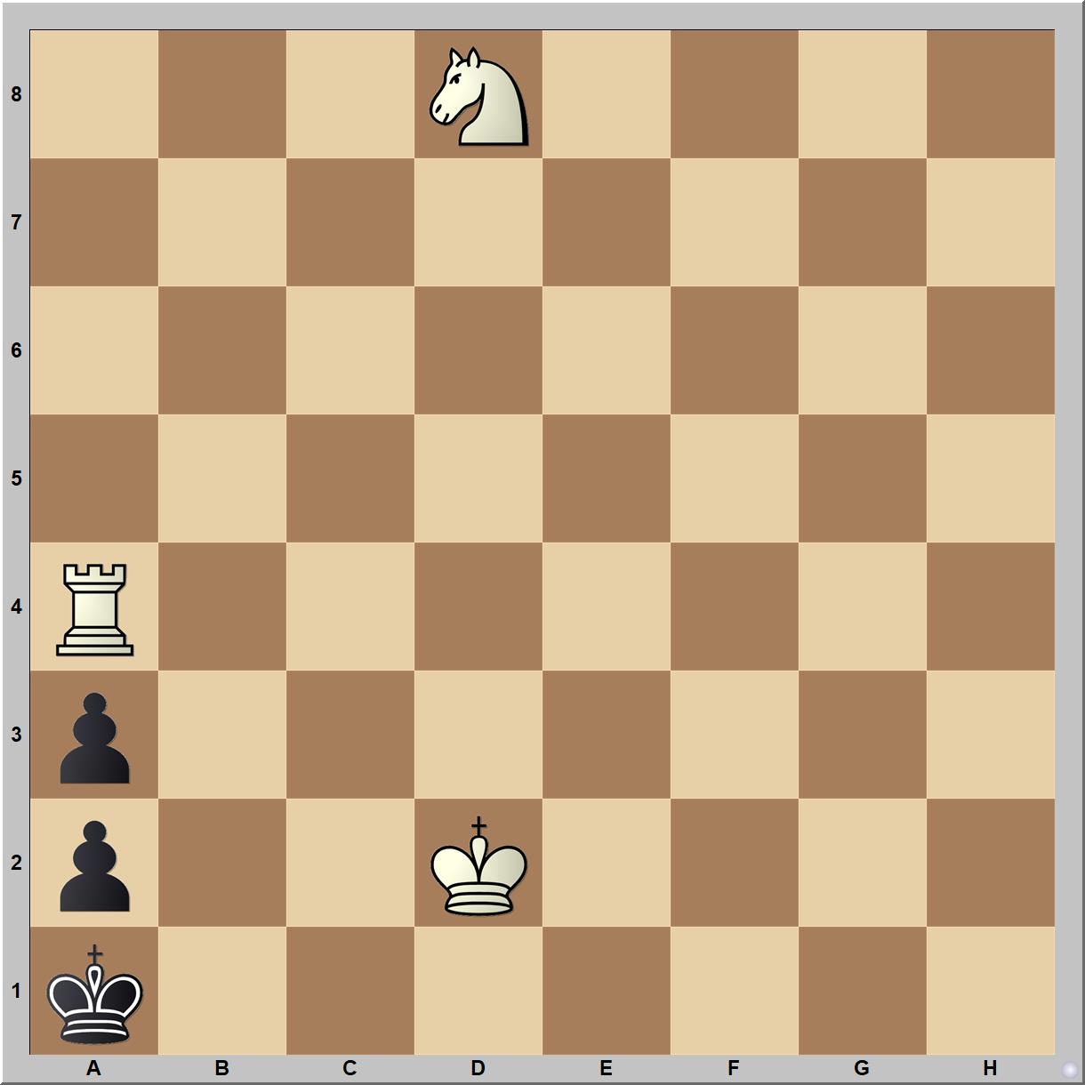 Bernhard Horwitz 1881-es tanulmányában világos 7 lépésben ad mattot, a pattveszélyt pedig a huszár oldja fel: 1.Ba8! Kb2 2.Bb8+ Ka1 3.Hb7!! Kb2 4.Hc5+ Ka1 5.Hb3+ Kb2 6.Hd4+ Ka1 7.Hc2 matt (1-0). Egy huszárral is lehetne mattot adni, ez szebb, de hosszabb lenne: 1.Hc6! Kb2 2.Bb4+ Ka1 3.Bc4 Kb2 4.Bc2+ Kb1 (4…Kb3 5.Ba2!) 5.Ba2! Ka2 6.Kc2 Ka1 7.Hd4 Ka2 (7…a2 8.Hb3 matt) 8.He2 Ka1 9.Hc1! a2 10.Hb3 matt.