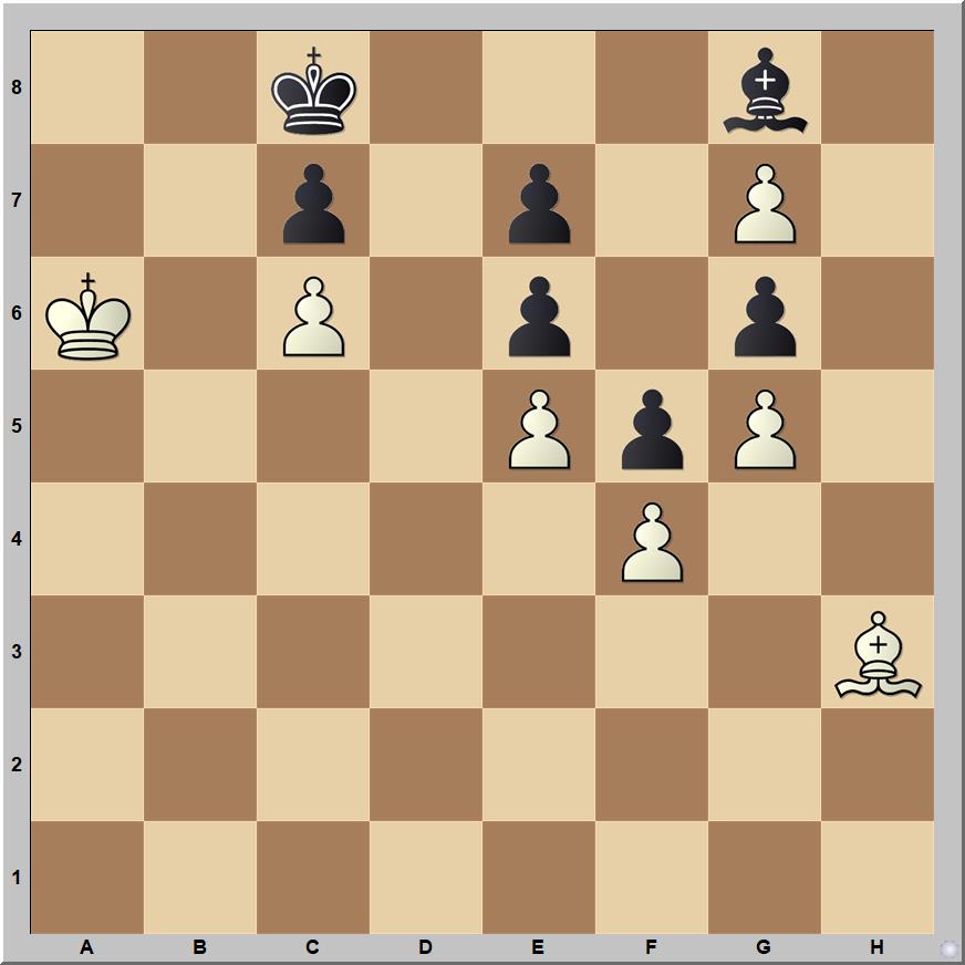 Bernhard Horwitz 1880-ban közzétett tanulmányában sötét nagyon beszorult, de ennek ellenére nem látszik, hogy hol tud áttörni világos. Gondolná valaki, hogy sikerét gyalogvégjátékban éri el? A megoldás: 1.Ka7! Ff7 2.Ff1 Fg8 3.Fa6+ Kd8 4.Kb8 Ff7 5.Fc8 Fg8 6.Fd7 Ff7 7.Ka7! Fg8 8.Kb7 Ff7 9.Fe8!! Fe8 (9…Ke8 után 10.Kc7 nyer) 10.g8H!! (10.g8V? patt) Ff7 11.He7!! Ke7 (11…Fe8 után 12.Hg8 Ff7 13.Hf6 nyer) 12.Kc7 Fe8 13.Kb7 Fd7 14.cd7 Kd7 15.Kb6!! Kd8 16.Kc6 Ke7 17.Kc7 Ke8 18.Kd6 Kf7 19.Kd7!! nyer (1-0).