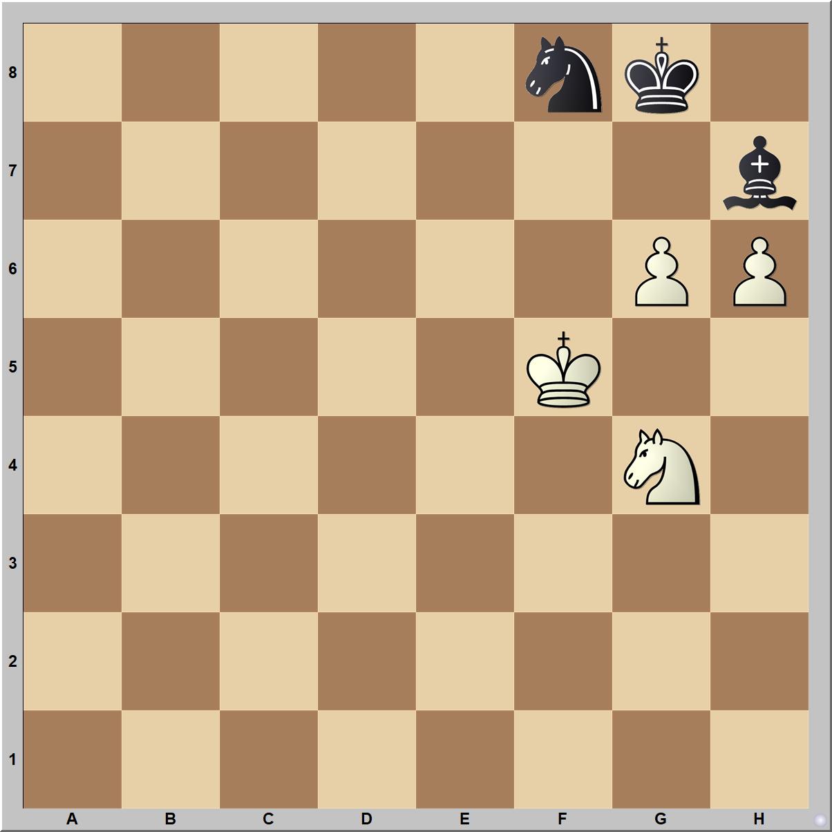 Bernhard Horwitz 1880-ban közzétett tanulmányában a kevés báb ellenére világos nyer: 1.Hf6+ Kh8 2.Hh7! Hh7 3.g7+ Kg8 4.Kg6!!, és a gyalogból vezér lesz (1-0).
