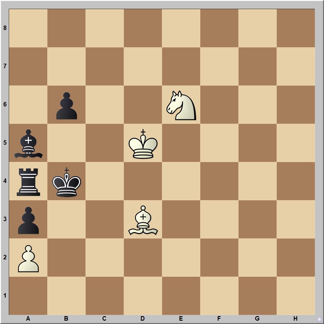 Bernhard Horwitz 1877-ben közölt tanulmányában világos minőséghátrányban van, de egy váratlan futóáldozattal nyer: 1.Fb5!! Kb5 (1...Kc3 után 2.Fa4 nyer) 2.Hc7+ Kb4 3.Kd4!! (lépéskényszert idézett elő) b5 4.Ha6 matt (1-0).