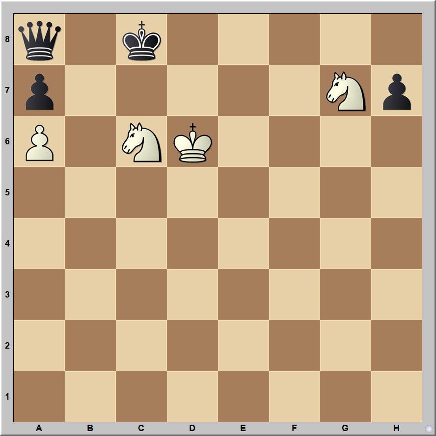 Bernhard Horwitz tanulmánya 1872-ban közölt tanulmányában két huszár harcol a vezér ellen, világos sikeréhez a gyalognak is fontos szerep jut: 1.Hf5! Vc6+ (két huszárral nem lehet bemattolni az egyedül maradt királyt, de 1...Vb7 2.Hfe7+! Ve7 3.He7+ Kb8 4.Hc6+ Ka8 5.Kc7! a főváltozatba vezetne, de 1...h5?? után 2.Hfe7 matt jöhet) 2.Kc6 h5 3.He7+ Kb8 (3...Kd8 után 4.Kd6 h4 5.Hc6+ Kc8 6.Ha7+ Kb8 7.Hb5 h3 8.Kc6 h2 9.a7+ Ka8 10.Kb6 h1V 11.Hc7 matt, vagy 5…Ke8 után 6.Ha7 h3 7.Hc6 h2 8.a7 h1V 9.a8V+ Kf7 10.He5+ felfedett támadással lenyeri a vezért) 4.Kd7 h4 5.Hc6+ Ka8 6.Kc8 h3 7.He7 h2 8.Hd5 h1V 9.Hc7 matt (1-0).