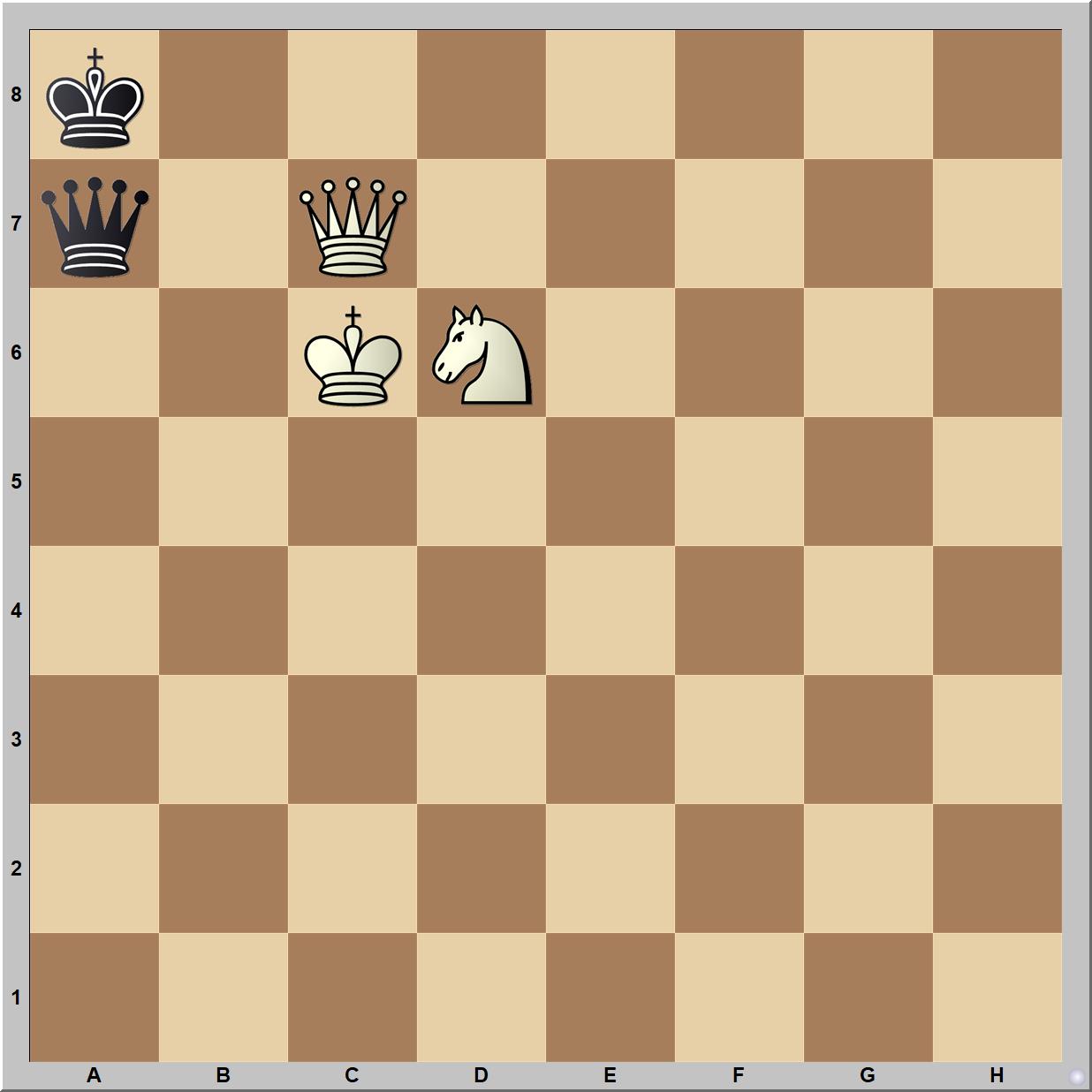 Bernhard Horwitz 1871-es tanulmányában a kevés báb ellenére világos nyer: 1.Vd8+ Vb8 2.Va5+ Va7 3.Vd5!! (lépéskényszerbe hozza sötétet) Vh7 4.Hf7!! kizárja a vezért a játékból és 3 lépésben mattot ad (1-0).