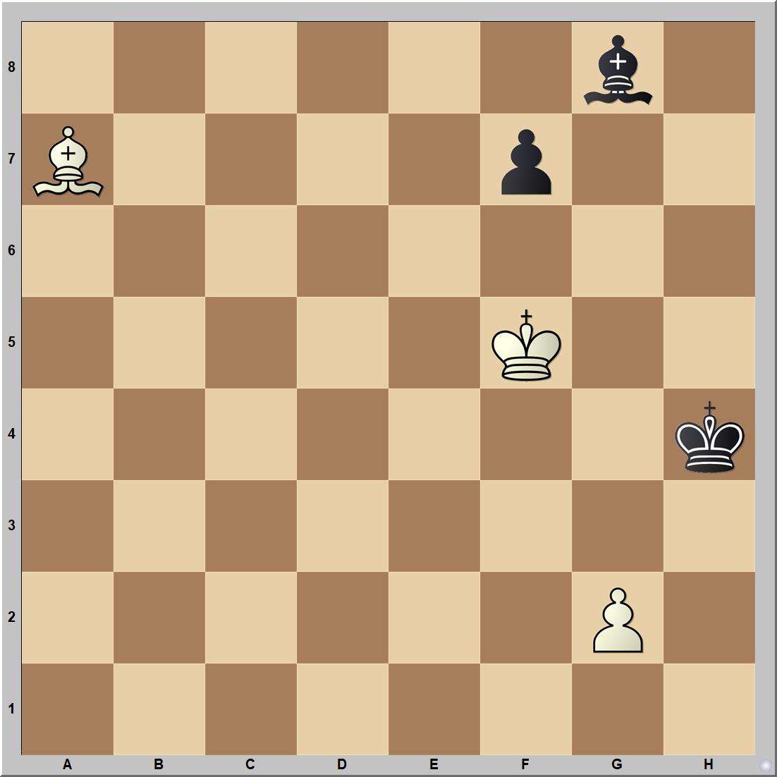 Bernhard Horwitz 1857-es tanulmányában világos 8 lépésben mattot ad: 1.Ff2+ Kh5 2.g4+ Kh6 3.Kf6! Kh7 (3...Fh7 4.Fe3 matt) 4.g5 Kh8 5.Fd4! Kh7 (5...Fh7 6.Kf7 matt) 6.Fc3 Kh8 7.g6! fg6 8.Kg6 matt (1-0).