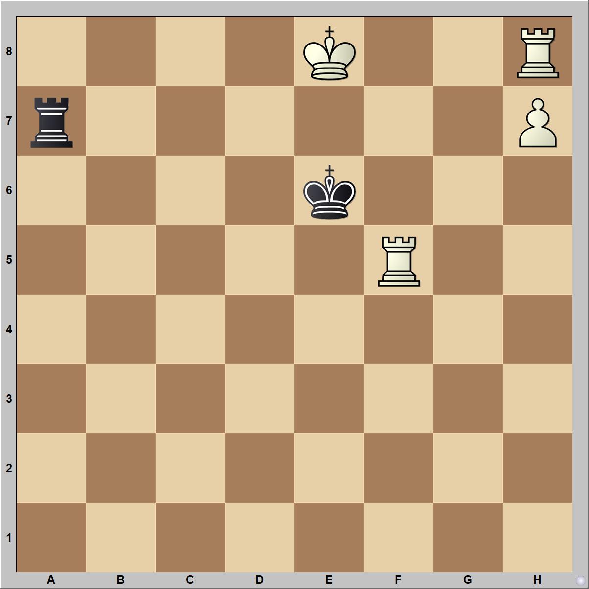 Bernhard Horwitz 1860-as tanulmányában sötét Ba8 mattal fenyeget, ráadásul világos bástyája is ütésben van. Azonban világos mindkét bástyáját feláldozza és nyer: 1.Bf6+!! Kf6 2.Bf8+ Ke6 3.Bf6+!! Ke5 (3...Kf6 után 4.h8V+ sakkal változik át vezérré a gyalog) 4.Bh6!! (4.h8V? Ba8+! döntetlen) Ba8+ 5.Kf7 Bh8 6.Kg7 nyer (1-0).
