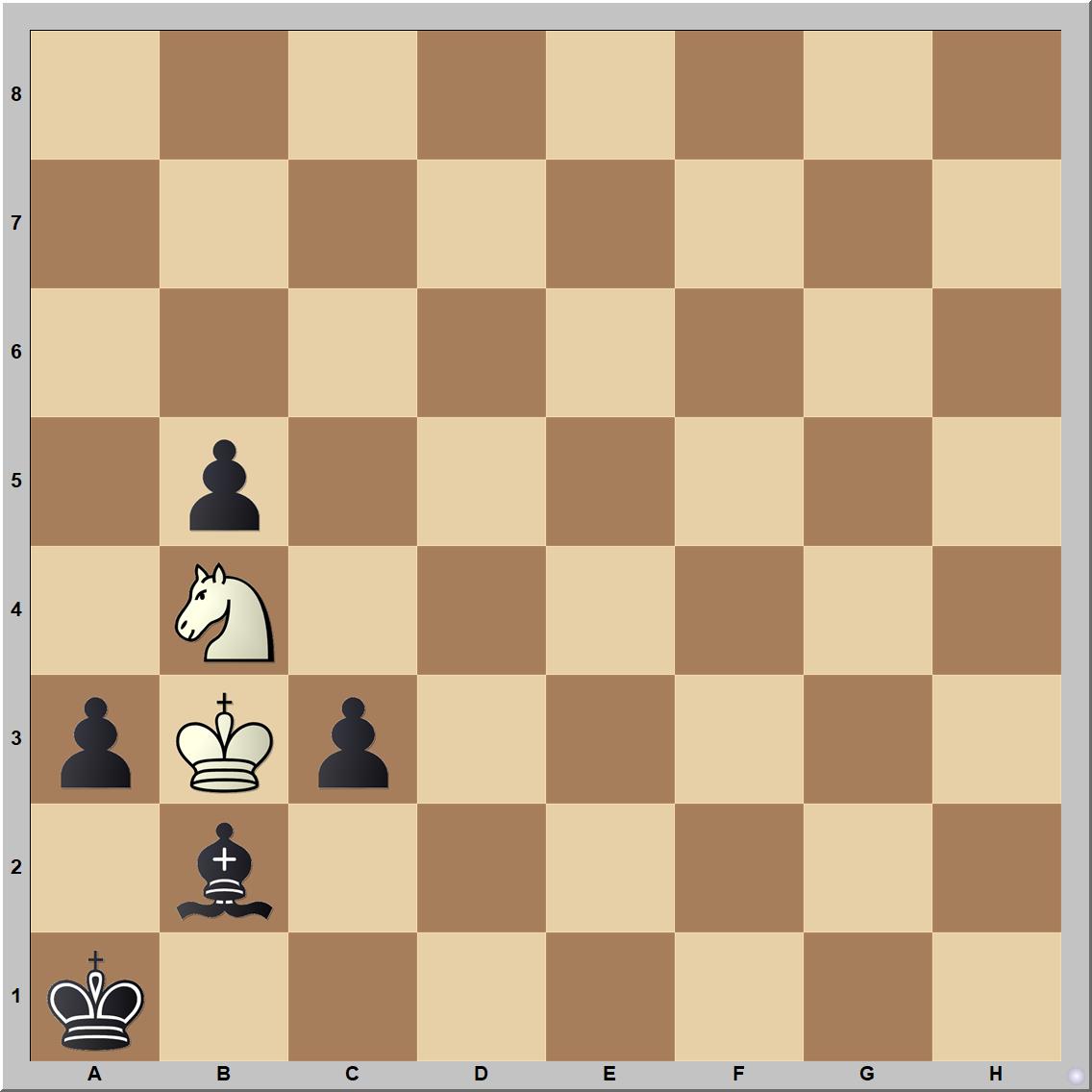 Bernhard Horwitz 1861-ben közzétett tanulmányában sötétnek három gyalog előnye van, de királya szorongatott helyzete miatt épp ezek miatt kap mattot hat lépésben: 1.Kc2! Fc1 (1…a2 után 2.Hc6 b4 3.Hd4 b3+ 4.Hb3 matt jöhet) 2.Kc1 c2 3.Kc2 a2 4.Hd3 (feloldja a pattot) b4 5.Hc1 b3+ Hb3 matt (1-0).