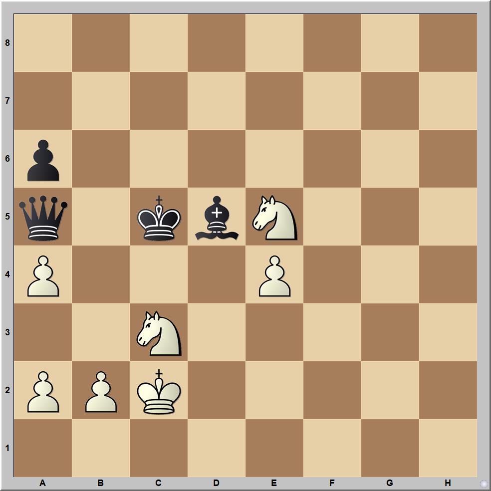 Bernhard Horwitz 1861-ben közzétett tanulmányában sötét anyagi előnyben van, de a legerősebb sötét báb a huszárok csapdájába esik és világos nyer: 1.b4+!! Kb4 (1...Vb4 után 2.Hd3+ Kc4 3.Hb4 Fe4+ 4.He4 Kb4 5.Hc3 a szélső gyalog „felnevelése” után nyer, de 3...Fb7 4.Hd3 után is világos lenne nyeregben) 2.Hd5+ Kc5 (2...Ka4 után 3.Hc3+ Ka3 4.Hc4+ vagy 3...Kb4 esetén 4.Hc6+ vezérnyerés jöhet) 3.Hb6!! (igazi csemege, tanulmánylépés, mely után sötét elveszíti vezérét) Ve1 (sötét lépéskényszerbe került, 3...Vb6 után 4.Hd7+, 3...Kb6 után 4.Hc4+, más lépésekre a huszár a c6 vagy a d3 mezőkön adja a sakk-sekket) 4.Hd3+ (1-0).