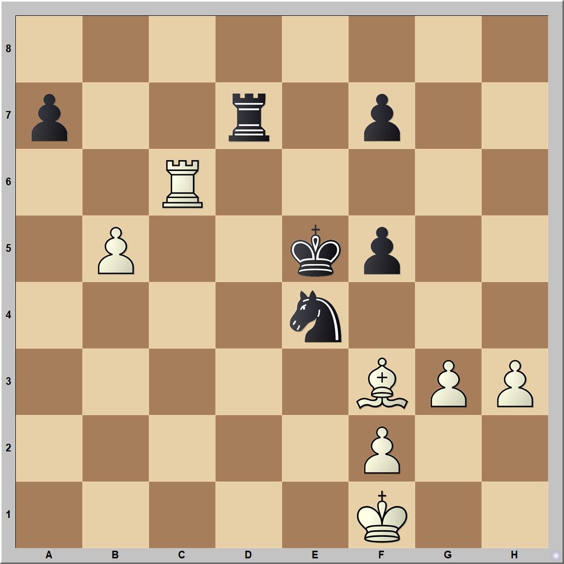 A Szingapúrban zajló Gukesh – Ding sakkvilágbajnoki döntő keddi, 7. játszmájában a sakktörténelem eddigi legfiatalabb kihívója, a 18 éves Dommaraju Gukesh (2783) indiai nagymester világossal kihagyta a nyerést és 44.Ke1?! f6 45.h4 Bd3 46.Fd1?! f4 47.gf4+ Kf4 folytatás után a 73. lépésben Ding döntetlent ért el. Gukesh az időellenőrzés után az ábraállásban nyert bástyavégjátékot érhetett volna el: 44.Fe4!! fe4 (44…Ke4?? után 45.Bc5!! f4 46.Bc4+ Kd5 47.Bf4 vagy 46…Bd4 47.Bd4+ Kd4 48.Kg2 Ke4 49.g4 nyer) 45.Bc5+ Ke6 (45…Bd5?? után 46.Bd5+ Kd5 47.h4 Ke5 48.Ke2 Kf6 49.h5 Kg5 50.h6 Kh6 51.Ke3 f5 52.Kf4 Kg6 53.g4!! fg4 54.Kg4 nyer) 46.g4 Bd1+ 47.Kg2 Bd2 48.Bc6+ Ke5 (48…Ke7 után 49.Bc7+ Kf6 50.Kg3 Bd3+ 51.Kf4 Bh3 52.Ba7 Bf3+ 53.Ke4 Bf2 54.Kd4 nyer) 49.Bc7! Kf6 50.Kg3 Bd3+ 51.Kf4 Bh3 52.Ba7 és világos nyer (1-0).