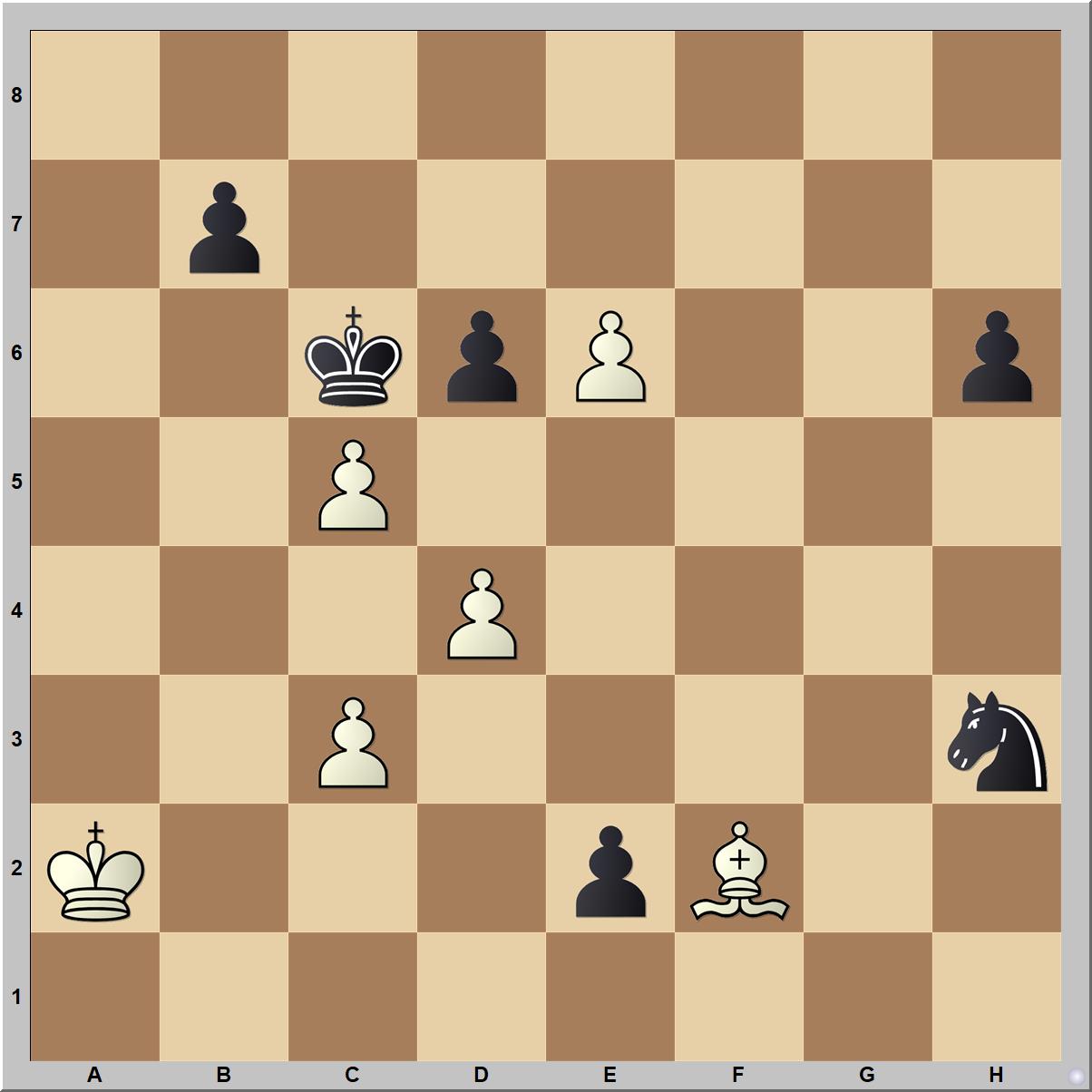 Leonyid Kubbel tanulmányában világos indul és nyer, de oda kell figyelni, mert a védekezésben sötétnek is vannak tartalékai: 1.d5+! Kd5 (1…Kc7 után 2.Fg3 Hf4 3.c4 nyer) 2.e7 Hf2 3.e8V Hd3! (3…He4! után 4.Vh5+ Kc6 5.Vh1!! kötés nyer) 4.c6!! (persze 4.Ve2?? Hc1+ után már sötét nyerne) bc6 5.Vh5+ Kc4 6.Ve2 és a huszárt lekötötték (1-0).