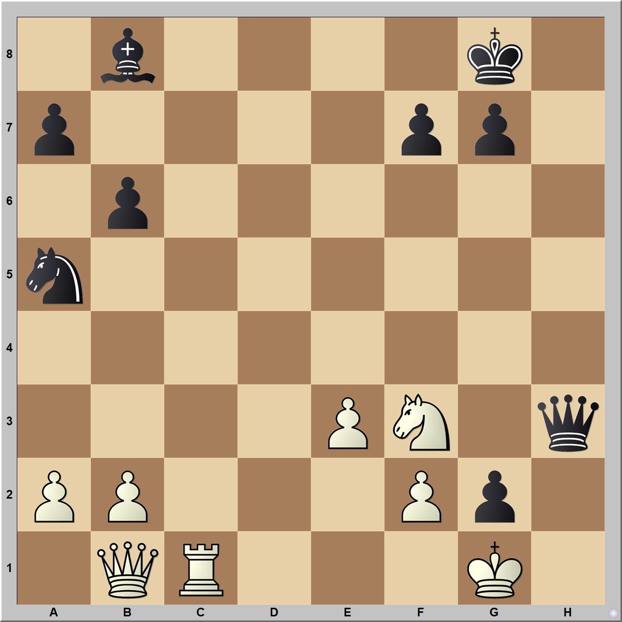 Első ránézésre úgy tűnik, hogy az ábrán látható állásban világos nagy bajban van, hiszen 1…Vh1 matt fegyeget és 1.Bc8+?? Vc8 csak késleltetni tudja a mattot. Aki sok tanulmányt fejt, az viszont rájöhet a meghökkentő vezéráldozatra, mellyel világos megnyeri a játszmát: 1.Vh7+!! Kh7 (1…Vh7?? után 2.Bc8 matt jöhet) 2.Hg5+ Kg6 3.Hh3 Fe5 4.b3 és minőségelőnnyel világos nyer (1-0).