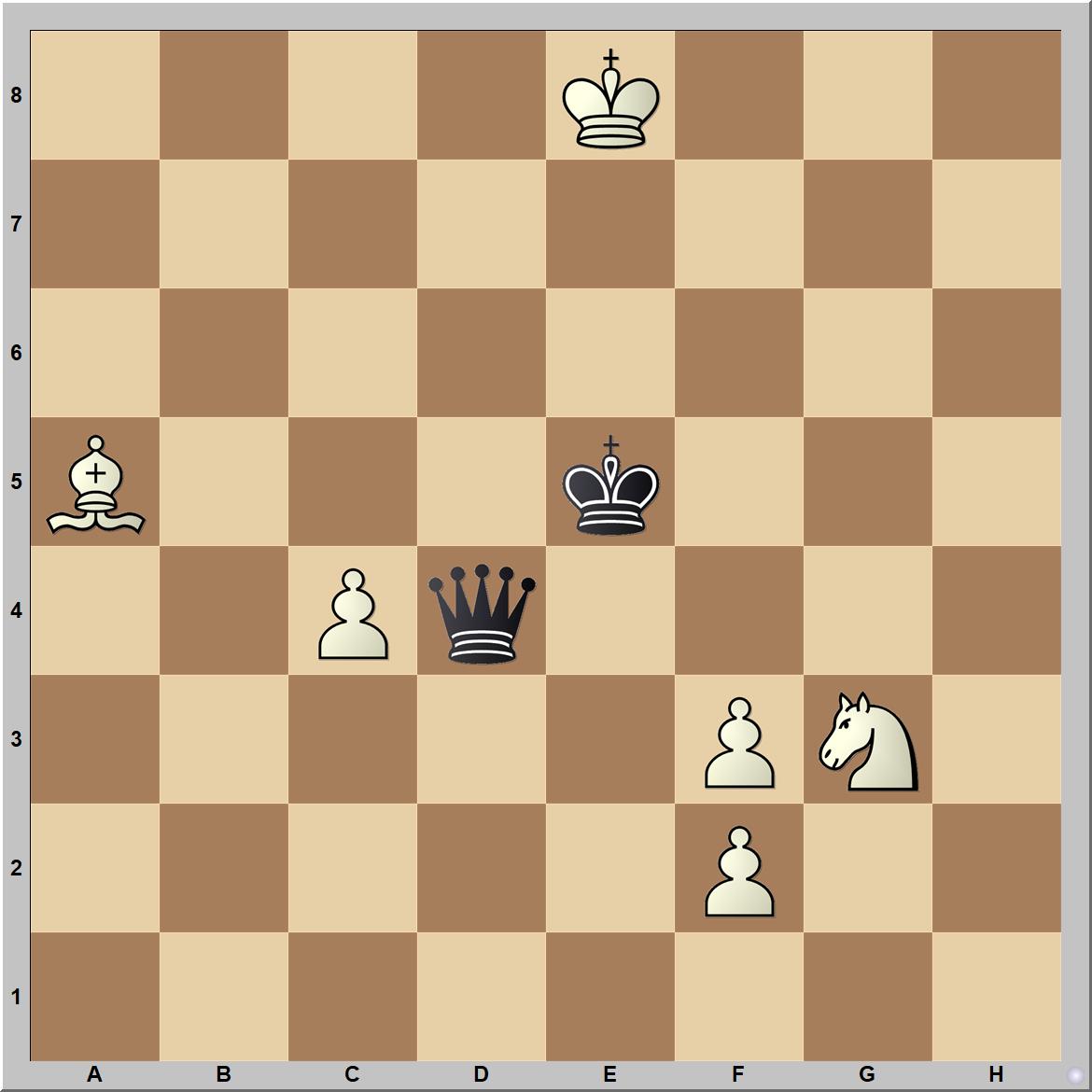 Niharendu Sikhar indiai szerző 1963-ban megjelent alkotásában a kevés báb ellenére világos a „sok lúd disznót győz” közmondást igazolva, ráadásul futóját is feláldozva nyer: 1.Fc3!! Vc3 2.f4+ Ke6! (más királylépésre 3.He2 vagy 3.He4 „sakk-sekk” jöhet) 3.f5+ Ke5 4.f4+ Kf4 5.He2+ Kf5 6.Hc3 Ke5 7.Ha4 (1-0).