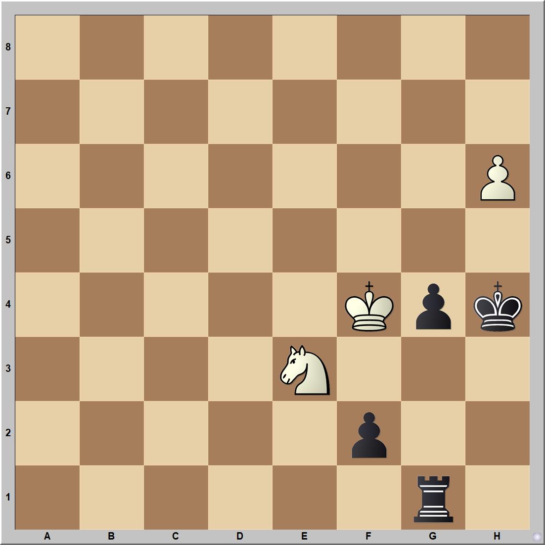 Domenico Lorenzo Ponziani (1719–1796) művében világos huszáráldozattal nyer: 1.Hf1!! Bf1 2.h7 és világos nyer (1-0) mert 2…Kh3 után 3.h8V+ Kg2 4.Va8+!! Kh2 (4…Kh3 5.Va3+!!) 5.Va7 g3 6.Vh7+ Kg2 7.Ve4+ Kh2 8.Kf3 g2 9.Vh4+ Kg1 10.Vg3 után mattot kap.