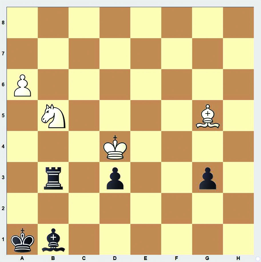 Paul Joița (1937–2000) művében világos egy futóval ad mattot: 1.a7 Ba3 (1…Bb4+ után 2.Kc5!! Ba4 3.Ff6+ Ka2 4.Hc3+ Kb3 5.Ha4 d2 6.a8V d1V 7.Vb7+ Kc2 8.Vb2+ Kd3 9.Vd4+ nyer) 2.Ha3 g2 3.Kc3!! g1V 4.Hc2+!! dc2 5.Ff6!! Vg8 (5…c1V+ 6.Kb3+ matthoz vezet) 6.a8V+ Va8 7.Kb3 matt (1-0).