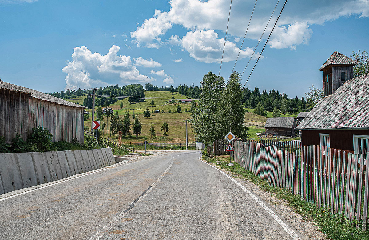 Lesőd irányába indulunk. A földút egyre rosszabb, a vízfolyások rendesen megdolgozták. Bár mondják, hogy a Daciát a helyi útviszonyokhoz találták ki, azért ami sok, az sok – így csak a tetőig zötykölődünk fel, de onnan már látható Lesőd, elbújva a völgyben a sűrű fák között.