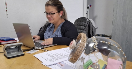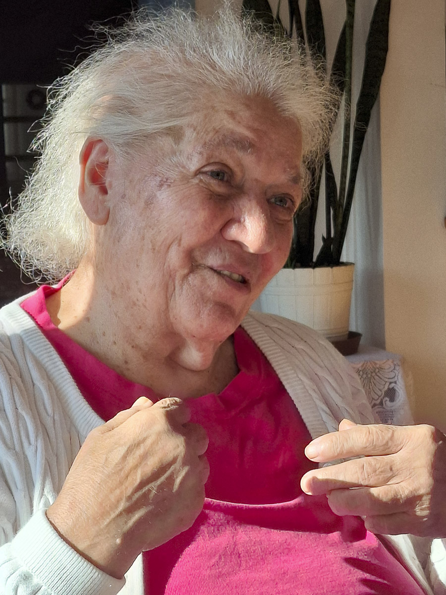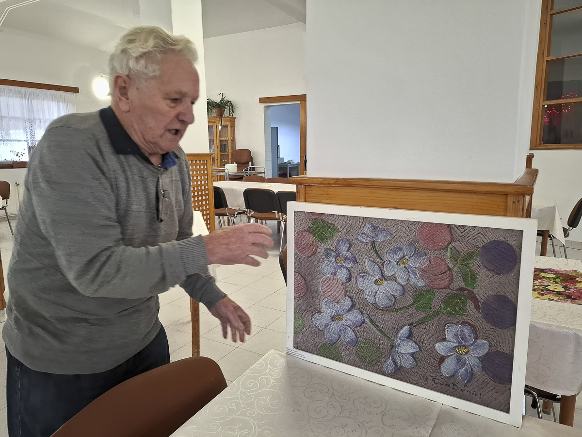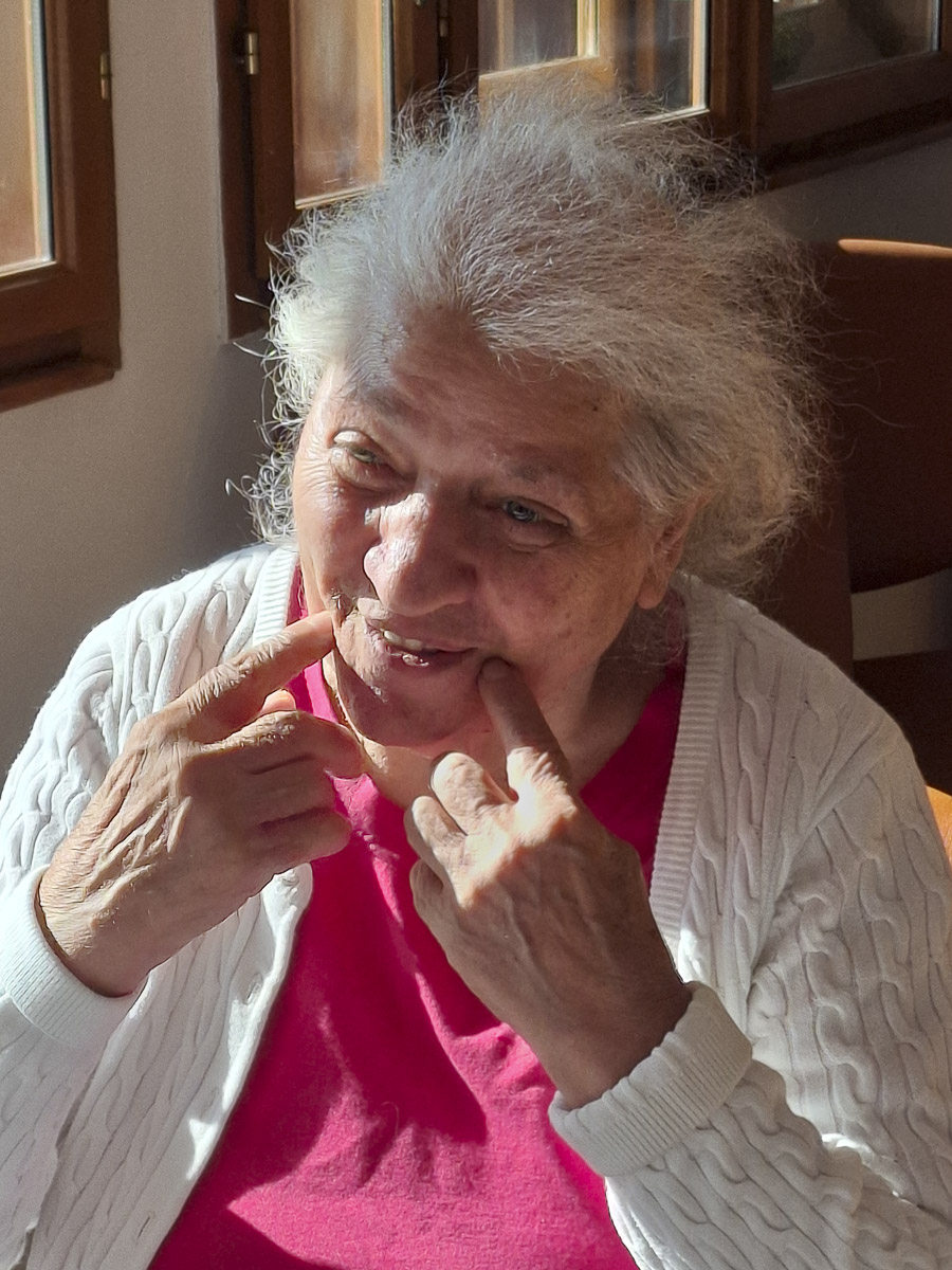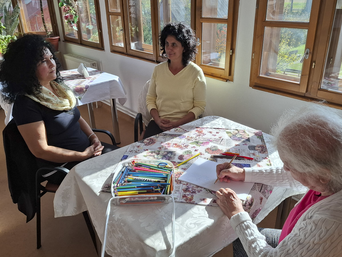 Egy év alatt Éva néni lemondott a kerekesszékről. A folyosón sétált, amikor Kiss Gabriellával meglátott minket. „Én titeket lefestelek, ez a göndör haj, ez a szép arc... csak valami szép rózsás ruhát vegyetek magatokra!” Kaptunk az alkalmon, hisz modellnek még sosem kértek fel. Éva néni vásznat és olajfestéket kért, mi lealkudtuk fehér papírra és színes ceruzára. Modellt ültünk, szemközt a művésszel, aki rutinos mozdulattal próbálgatta, milyen vonalakból sejlik ki az arc alakja. Kicsit a Gabriella vonásain dolgozott, aztán áttért az én szám kontűrjére, míg el nem varázsolta teljesen a hátunk mögötti ablakból látható táj. Már csak azt látta, rajzolta a fákat, a domboldalt átszellemülten. Ügyet sem vetett arra, hogy Gabriella, a demencia kutatója elmagyarázza, miért tolódnak a lap szélére a központi elemek, hogyan szűkül be a demenciával élő ember látóköre.
