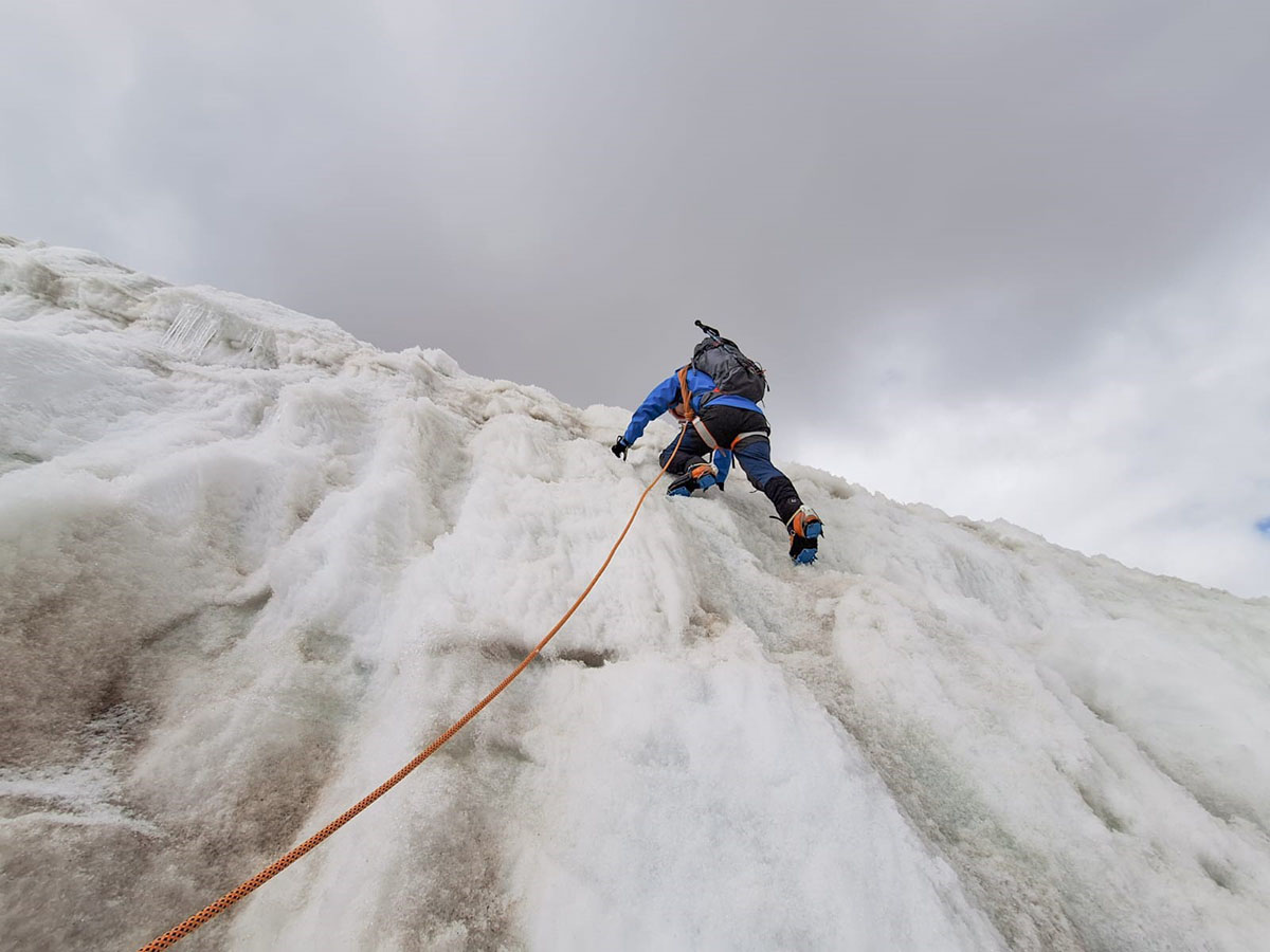 Másnap hajnali négy körül indultunk csúcstámadásra. A hegygerinc következő hegye egy hatalmas, meredek kőomlás volt, ami eléggé megkínzott. Még jó, hogy a sötétben nem láttuk a tetejét. A következő hegyek meredek oldalai és keskeny sziklás környezete miatt jobbnak láttuk már itt bebiztosítani magunkat, rövidkötél-technikával (short roping). Végeérhetetlennek tűnő kőomlások és sziklás oldalak után értük el a hóhatárt, ahol felcsatoltuk hágóvasainkat, és a túrabotjainkat jégcsákányokra cseréltük. Nem adta könnyen magát a hegy. A hóhatár közel 5500 méternél kezdődött, rögtön egy meredek jégfallal. A meredek oldal egy közel függőleges jégfalban végződött, majd még egy pár méter után elértük a Stongde Kangri csúcsát 5823 méter magasan.