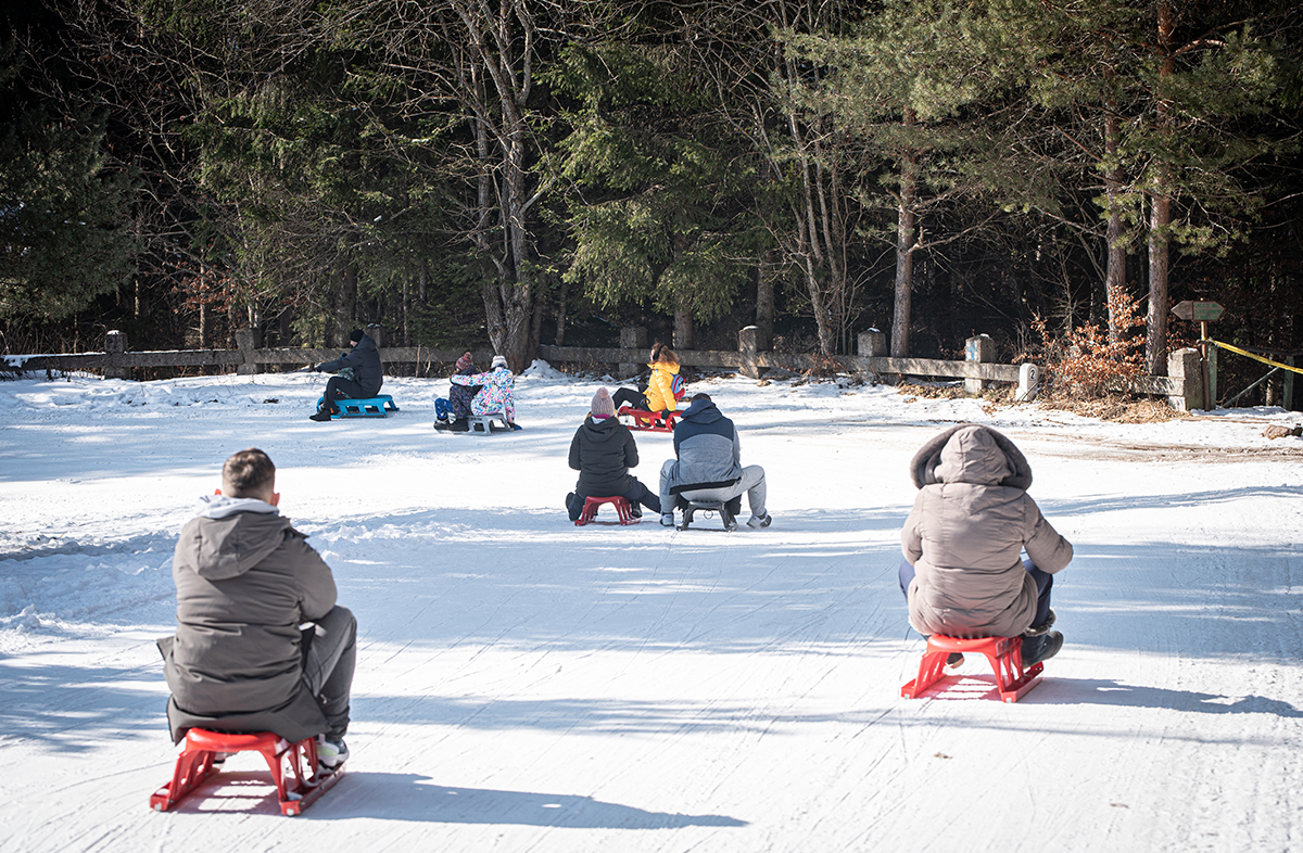 Miközben erről beszélgettünk, Gombi sóvárgó szemekkel figyelt minket. Bizonyára megkívánta a kürtőskalácsot. Gazdája egy feltétellel, de megengedte, hogy megkínáljam. Nem szabadott adni addig a kalácsból, míg nem mondtam: tessék! Ügyes kutya – állapítottam meg, hiszen tényleg csak a „biztatás” után fogadta el a falatot. No, de nem ettől számít ő hegyi asszisztensnek, hanem inkább attól, hogy hamar jelzi, ha éppen vad jár, és ahogy a gazdája mondta: „hívó szóra, medve nélkül érkezik vissza”. Habár – mint megtudtuk – a télen mindössze egy alkalommal tette tiszteletét a medve, akkor is este. A turisták azonban ennél jóval sűrűbben – hétvégi napokon akár több százan is – látogattak a krátertóhoz. Különösen zsúfoltság volt a szilveszter előtti napokon, illetve az új év első hetén. Még a kora tavaszi napokon is, hó függvényében, lehet szánkót bérelni másfél órás ciklusokra. A tó partjáról terepjáróval, speciális vontatóval történik a szánkók felvonása. A szánkózási lehetőségekről, aktuális információkról mindenképp érdemes előre tájékozódni a Pro Szent Anna Egyesület Facebook-oldalán.