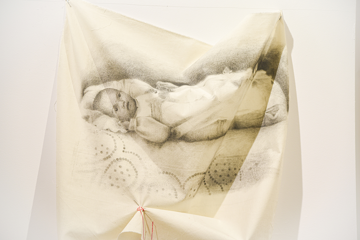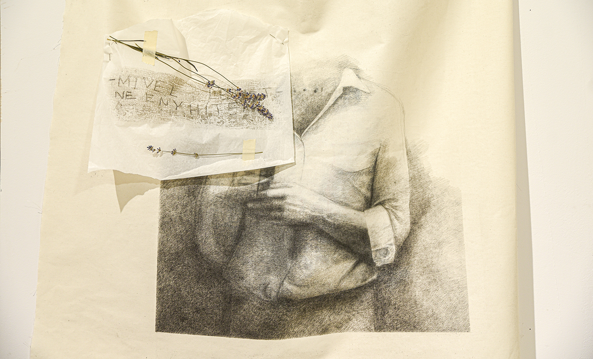 – Többnyire klasszikus ceruzarajzokat készítettem, a hordozófelület viszont némelyik munkánál nem papír. A textília egy valamikori női munkaeszköz emlékeztetője, ehhez egyértelműen kapcsolható a varrás mint az elvarrás szándékával végzett művelet szimbóluma.