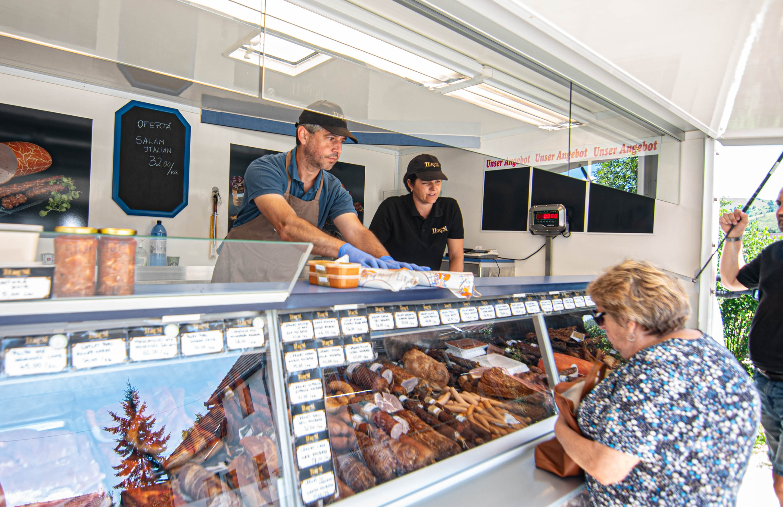 A mozgó húsbolt kínálatában közel százféle termék található. A teljesség igénye nélkül: friss, főtt szalámik, kolbászok, füstölt, pácolt termékek, darált hús, virsli, marhahús, lábszár velős csonttal, csülök csontos és csont nélküli formában, kenőmájas, tepertő, tepertőkrém, zsír és a zsírnak való, valamint különleges ínyencfalatok, mint például az Angus húsmarhából készült steak vagy a juh pastramă, a sózott, füstölt, érlelt, vékonyra szeletelve fogyasztott húskülönlegesség. Vannak időszakos termékek is, például kocsonya, ami csak ősztől kora tavaszig kapható. A vásárlók nagy kedvence még a miccspaszta, vagyis a csórékolbásznak való húskeverék, de aki nem akarja saját maga meggyúrni a kolbászkákat, megkaphatja megformázva, becsomagolva, már csak a grillrácsra kell rakosgassa. Mint megtudtuk, a vásárlók körében különösen népszerű a Hargita szalámi – amit különösen ajánlanak szendvicsek, hidegtálak készítéséhez és „éjjeli nasizáshoz is” –, de jól fogy a disznófősajt is. A vevők nagyon szeretik, bár a fősajtban lévő bőr kérdése megosztja őket. A Tercsi-recept alapján csak belefőzik a bőrt, de nem hagyják benne. Beszélgetésünket hallva egy vásárló közbeszól, hogy ő bizony benne hagyná, de mások hátrébb jelzik, ők az ellentáborba tartoznak. A sertésbőr kérdése tehát nem dőlt el, ennek ellenére a közbeszóló kliens egy jó darabot kért a disznófősajtból, ami, mint megjegyezte, „bőrtelenül is rendkívül finom”.