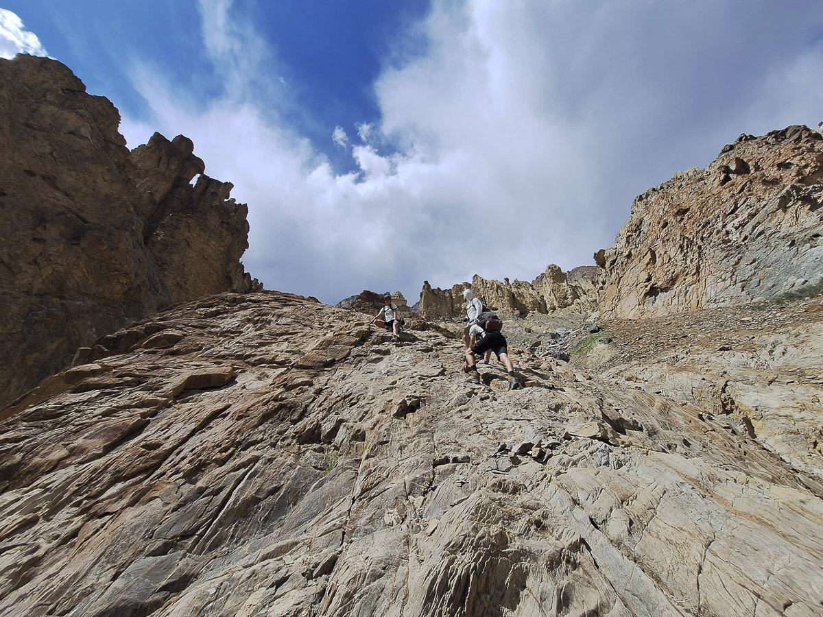 Amikor elértünk a gleccserfolyóhoz, bakancs nélkül többször is át kellett kelnünk a hideg és nagyon erős sodrású folyón. Egy nyugodtabb helyen ebédeltünk, és megmártóztunk a hideg vízben, ami igazi kihívás volt, lévén, hogy hatalmas volt a sodrás. A pihenés után folytattuk az utunkat, még háromszor át kellett kelnünk a már térdig-combig duzzadt folyón. A hegy oldalán könnyebb sziklamászással jutottunk fel a sztúpáig, amelynek belső falain a jelenleg ismert legrégebbi zanszkári falfestmények találhatók.