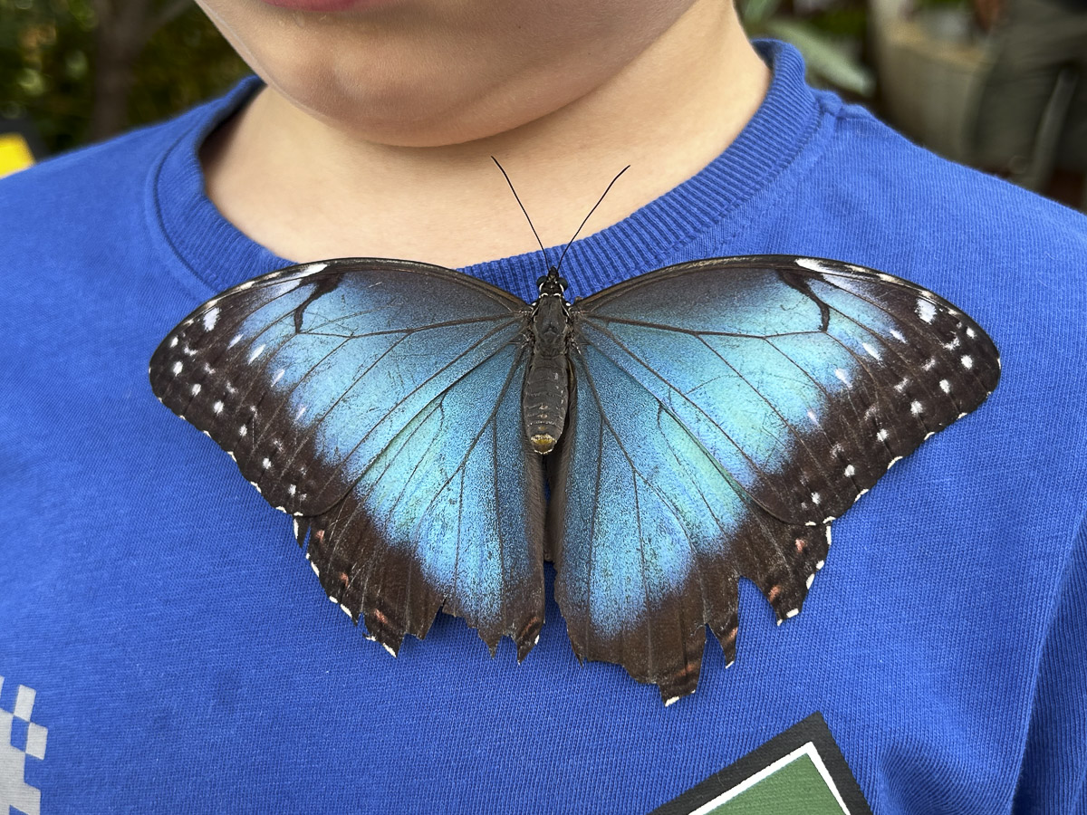Egy kisfiú a nagymamájával már több mint egy órája bent volt a lepkeházban, amikor mi odaértünk. „Egyszerűen nem lehet megunni” – mondták. A kissrác kék színű pólója a fotózásban is segítségemre volt: magához vonzotta a nagy azúrlepkét, amelynek gyönyörű színe csak akkor ragyog fel, ha kitárja szárnyait. A parajdi lepkeház egy igazi csodahely.