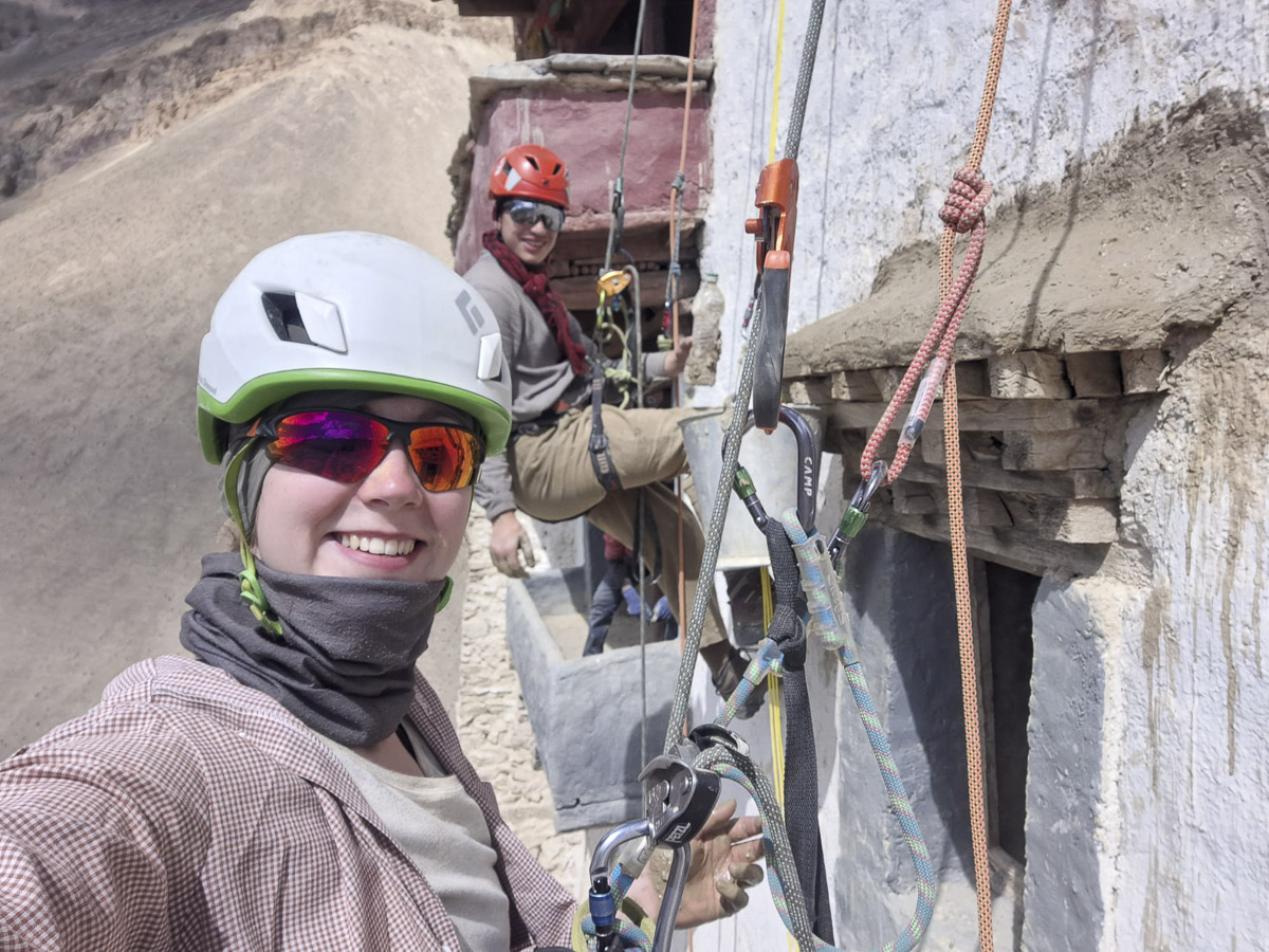 Második munkanapunkon megkaptuk a teljes felszerelést, amit alaposan megvizsgáltunk. A fémeszközöket megmostuk, beolajaztuk, és nekifogtunk kiépíteni a biztosítópontokat. Nem volt könnyű dolgunk, mert a palota vályogtéglákból épült, nincs benne vasszerkezet, se gerendák, oszlopok, szegek. Nagyon meg kellett nézzük, hogy hova tudjuk biztosítani magunkat. Kötélen leengedtük magunkat, majd az ablakok felett lévő párkányok visszaépítését kezdtük meg, illetve a falon lévő javításokat. Mindennap vályogozunk, és munka után a teljes felszerelést megmossuk a gleccservizű patakban. A helyiek az első napokban tátott szájjal nézték, ahogyan fel-le jártunk a kötélen a fal oldalán, és vályogoztunk a semmi közepén.