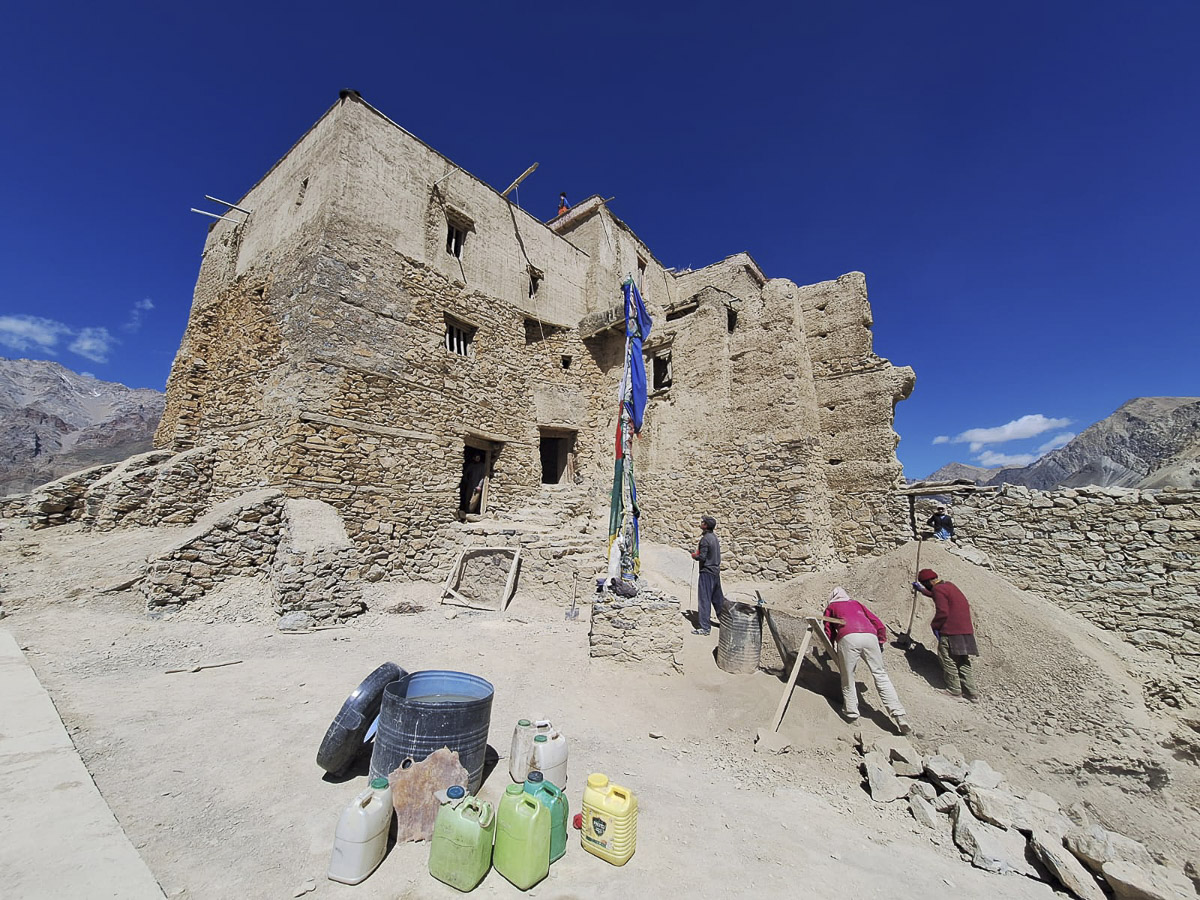 A palota egy szikla tetején található, két-három kilométerre a falutól, négyszáz méterrel magasabban. Az út végén sok, meredek lépcsőfok vagy könnyebb sziklamászás vár ránk, és ezt az útvonalat naponta többször is megtesszük. Első munkanapunkon körbevezettek minket a palotában, elmondták a terveket, megnéztük Kőrösi Csoma Sándor szobáját, majd mászófelszerelést kerestünk, amivel dolgozhatunk, mert a palota külső falain lévő, elérhetetlen helyeken való munkát nekünk szánták. Végül megtudtuk, hogy az egyik helyi lakosnál vannak elpakolva a felszerelések, de tizenkét éve senki sem használta őket, mert nem volt, aki tudta volna kezelni az ipari alpin felszerelést.