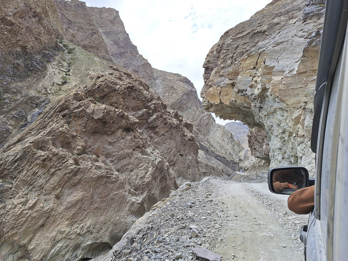 Lehben az összes taxiállomást felkerestük, alig találtunk valakit, aki elvitt bennünket Zanglába az új útvonalon. 3500–4200 méter magasan, szerpentines, keskeny utakon haladtunk, és az út borzasztóan poros volt. Pormaszkot viseltünk, de a kilencórás zötykölődés végére mindenhol fekete por borított minket. Ahogyan egyre mélyebbre utaztunk a hegyek közé, a szemünk elé tárultak a Himalája közel hétezer méter magas havas, jeges csúcsai.