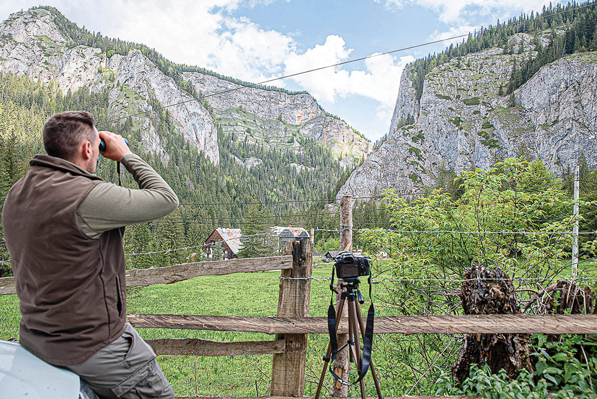 Hirtelen feltárult előttünk a Kis-Cohárd elképesztő, égig érő látványa. Jobbra a Postafal, balra a Kilátó és közöttük a Tündérkert. A rangerek kipakolják a szükséges eszközöket a csomagtartóból. Állvány a megfelelő objektívvel szerelt fényképezőgépnek – az állatok légvonalban 400-500 méter távolságra voltak tőlünk –, GPS a patások helyzetének regisztráláshoz, valamint messzelátó, aminek segítségével megtalálhatók a sziklafalon szétszórtan legelésző zergék. Avatatlan szemnek nehéz rájuk bukkanni, mivel beolvadnak a környezetükbe. Májusra már levedlik a téli fekete szőrüket, barnára cserélve azt. Ahogy kezdi megsütni a nap az ormótlan magasságokba emelkedő kőfalakat, úgy jövögetnek elő a zergék is rejtekükből, az erdőből.