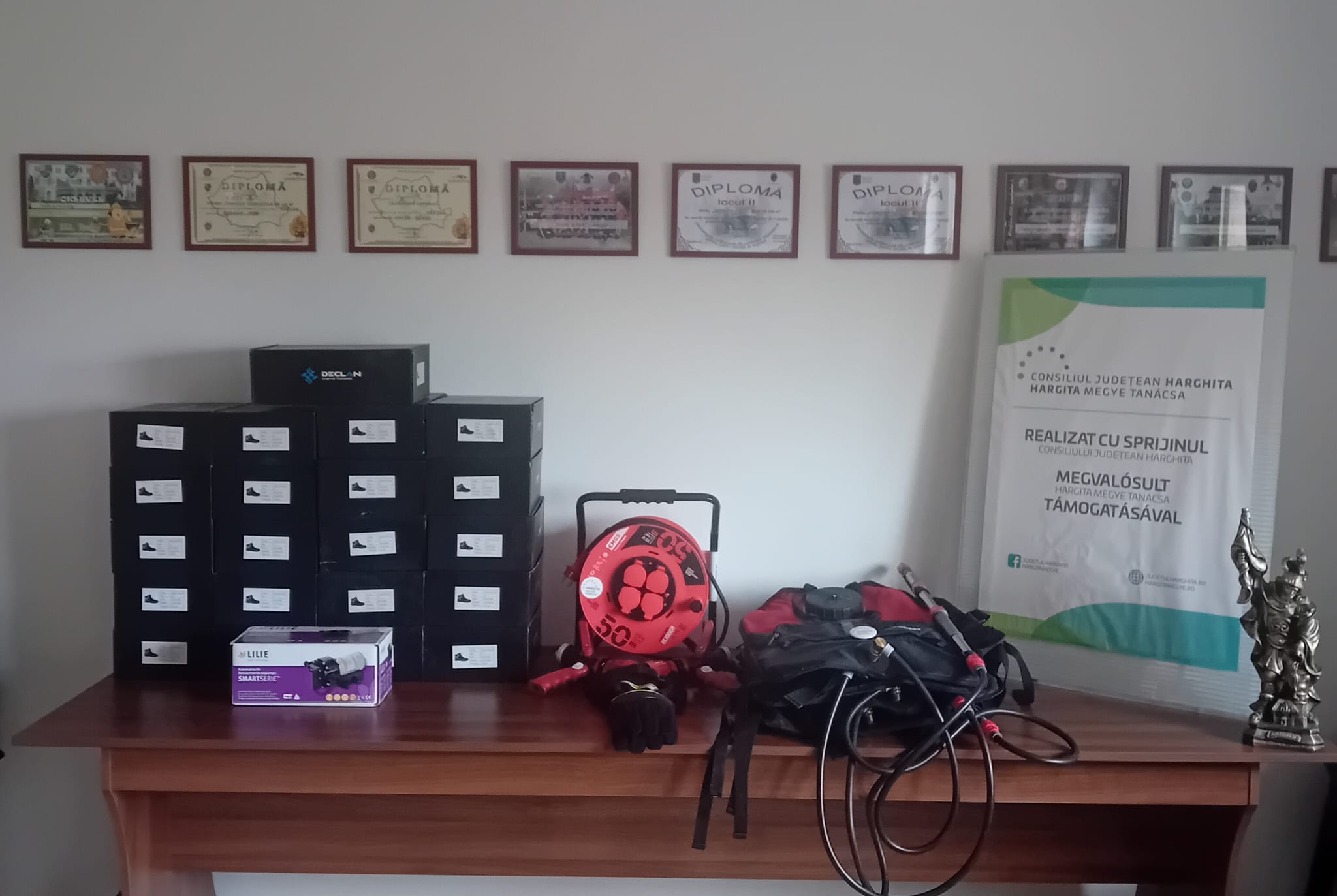 A helyi önkormányzatnál elnyert pályázat értéke ötezer lej, mondta el a sajtótájékoztatón Borbély Imre, ehhez 10-15 százalékos önrészt biztosított az egyesület. Ebből a támogatásból védőbakancsokat és elektromos szivattyút vásároltak. Az új eszközöket szeptember 16-án adták át a támogató megyei tanács elnöke és a helyi településvezetők jelenlétében.