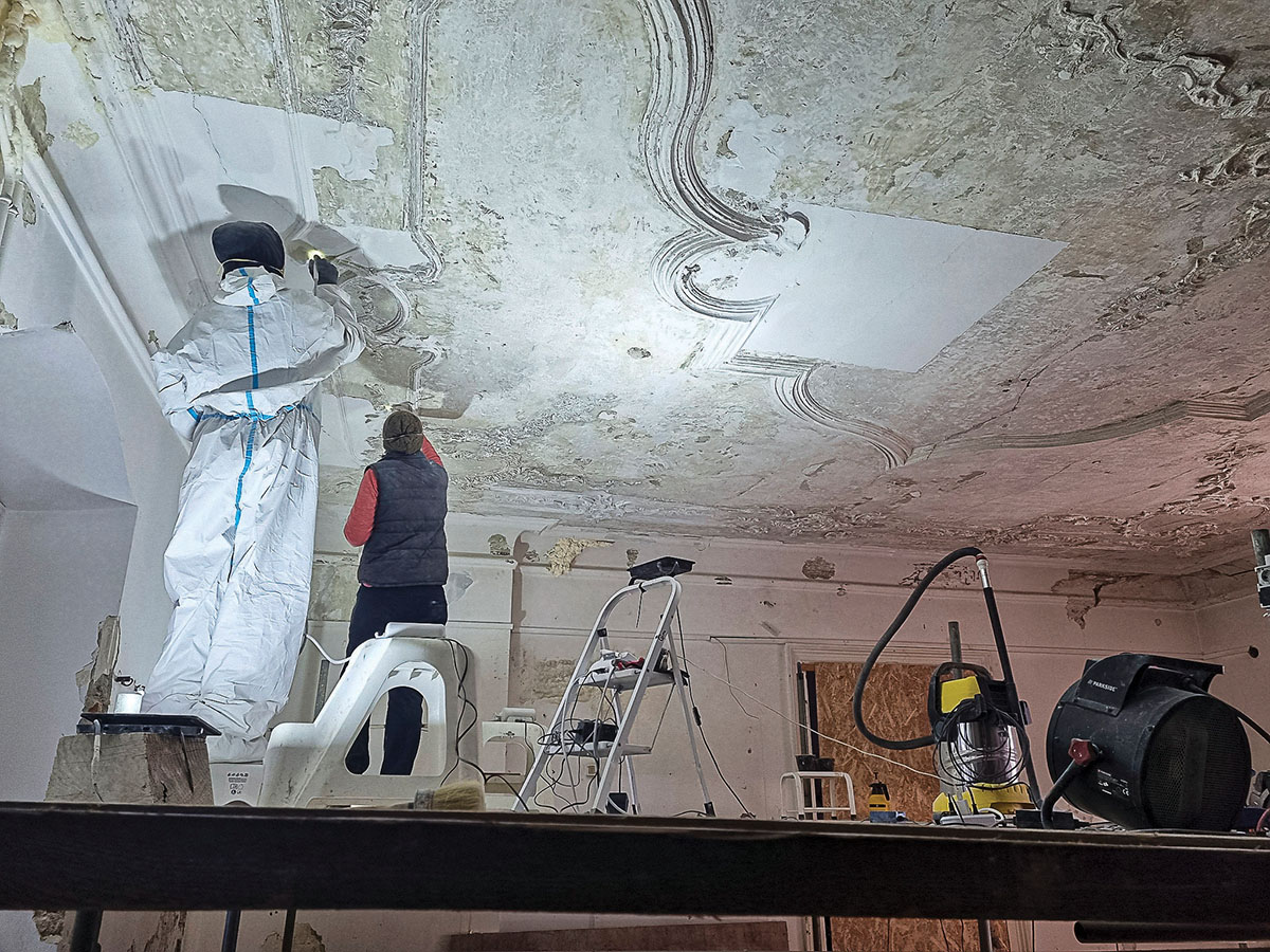 – A falakat megvizsgálták, feltártak minden fellelhető korlenyomatot, és megállapították, mi az, ami megmenthető és mi az, ami nem. Ebből készül egy dokumentációs anyag is az utókor számára. Jelenleg a mennyezeti díszek restaurálásával dolgoznak, hogy eredeti pompájukban láthassa majd a közönség