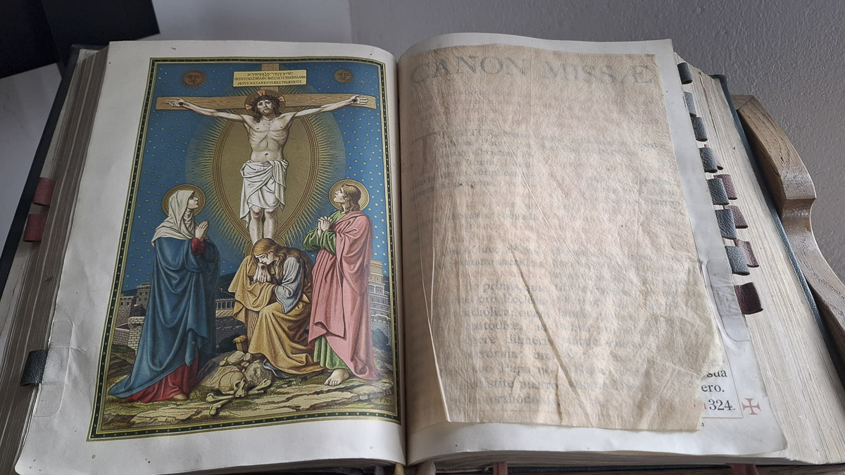 – A kiállítás időrendben negyedik legrégebbi darabja Kájoni János ferences szerzetes leghíresebb és irodalomtörténeti szempontból legjelentősebb művének, a Cantionale Catholicumnak harmadik kiadása. Az énekeskönyv gerince szétesett, védő-, előzék- és címlapjai hiányoznak, a kötéstáblái közül csak az előtáblája maradt ránk, amelynek közepén egy bepréselt kereszt látható. A számozott oldalak megvannak mind, csupán a kántorok ceremóniás könyvének „Mutató Táblája” végéről hiányzik néhány lap – részletezte a helytörténész.