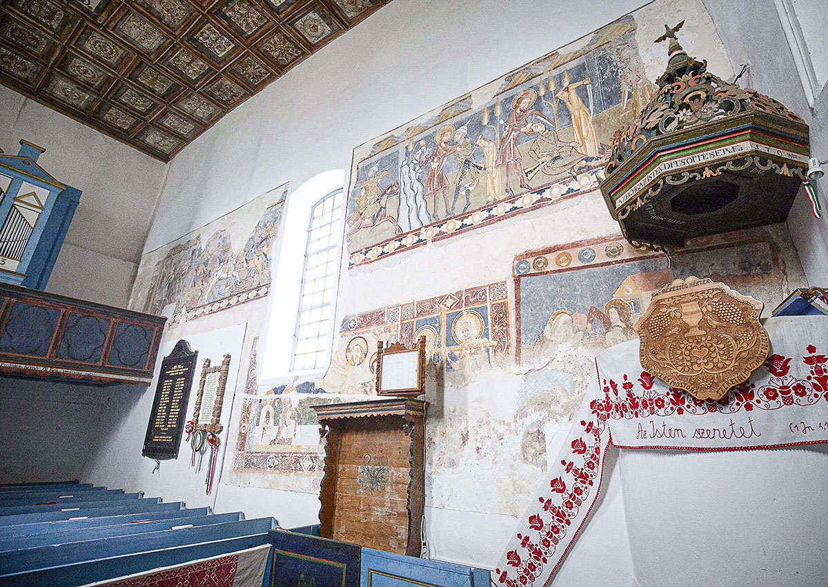 A templom alapos szemrevételezését követően a templombelsőt is büszkeséggel mutatta meg a lelkész. Az úrasztalát és a szószékkoronát 1798-ban készíttették, azóta restaurálták, az orgona pedig 1853-ban készült. Gyönyörű a restaurált kazettás mennyezet is, amely 1752-ben készült és 8 x 12 kazettából áll, felújításukat Mihály Ferenc végezte 2006–2008 között. A legszebb látványt mégis a 2006-ban feltárt falképek adják. Benedek Mihály elmondta, a templomhajó északi falán három falképet tárt fel Lángi József falkép-restaurátor.